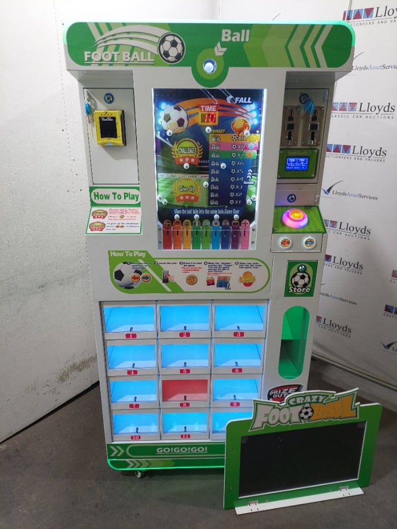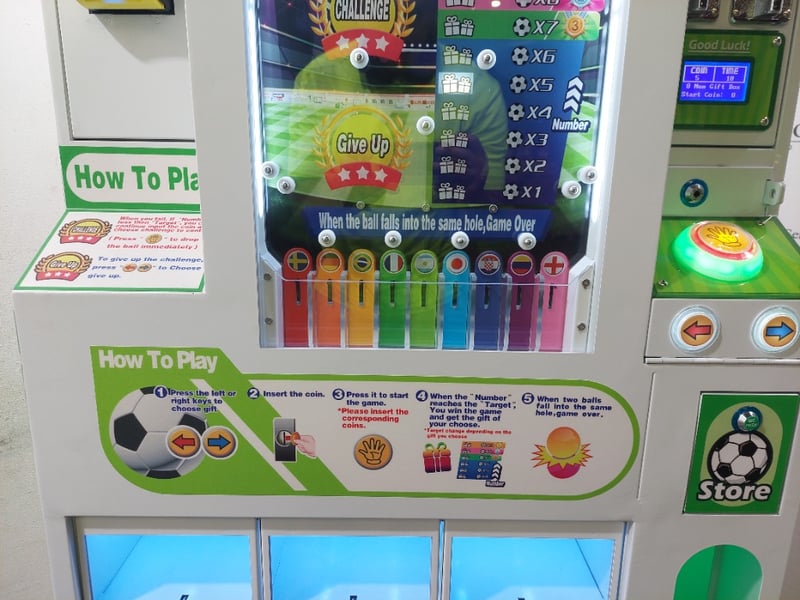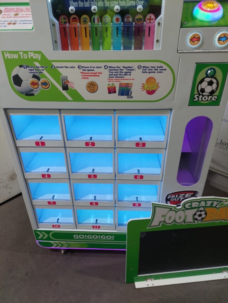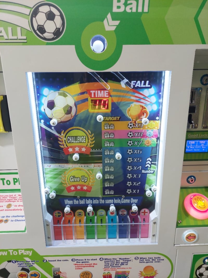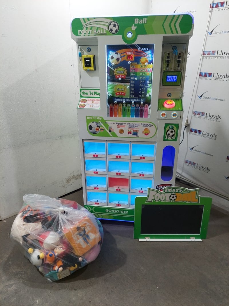 Desciption: This is a "Crazy Football" prize vending machine, also known as a drop ball game or gift machine. The game involves dropping a ball and attempting to guide it into a specific hole to win a prize, includes assorted anime plushies.