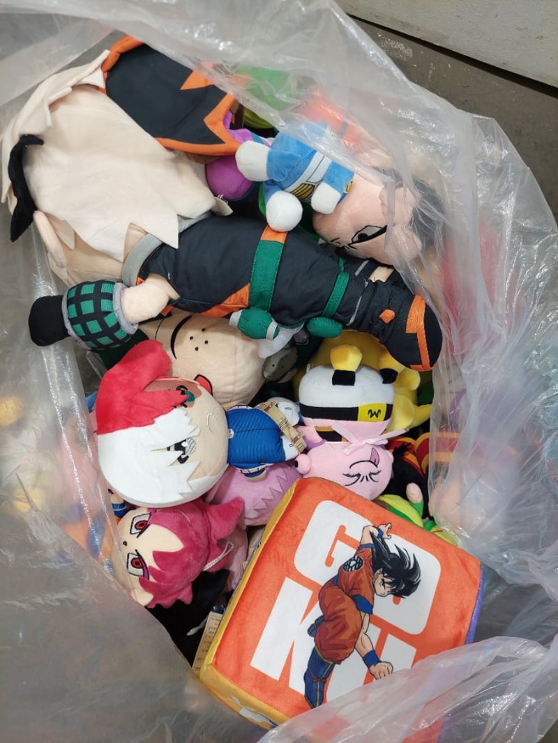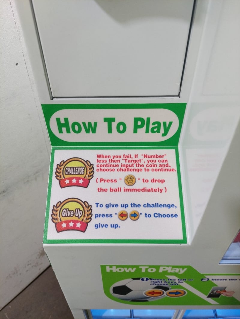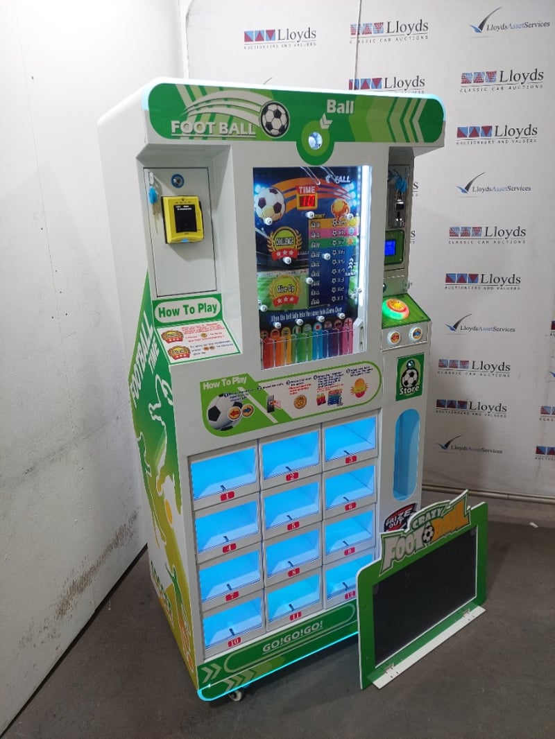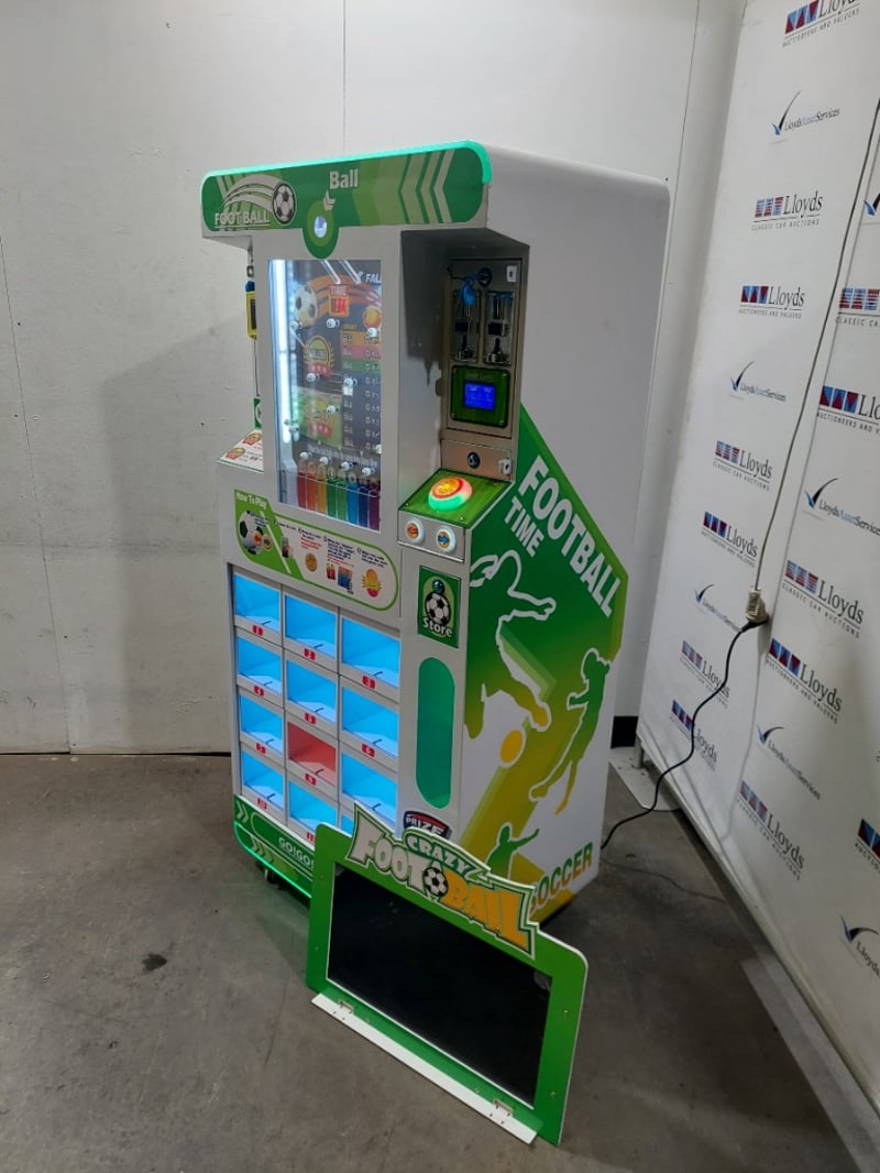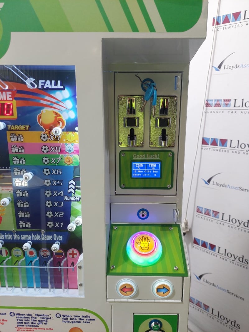 Desciption: This is a "Crazy Football" prize vending machine, also known as a drop ball game or gift machine. The game involves dropping a ball and attempting to guide it into a specific hole to win a prize, includes assorted anime plushies.