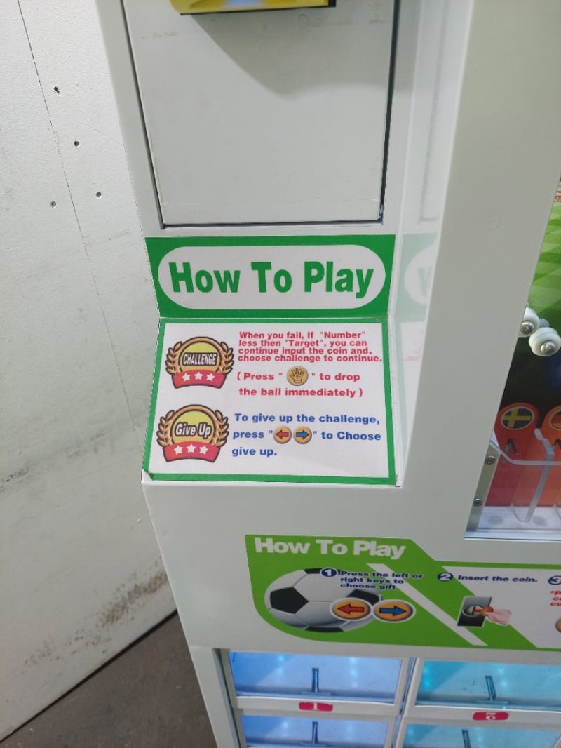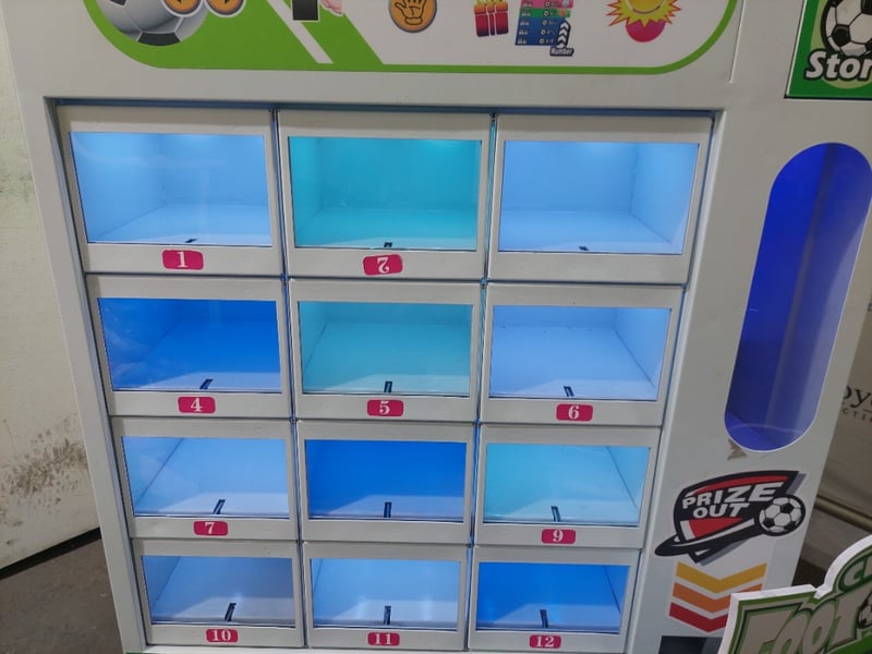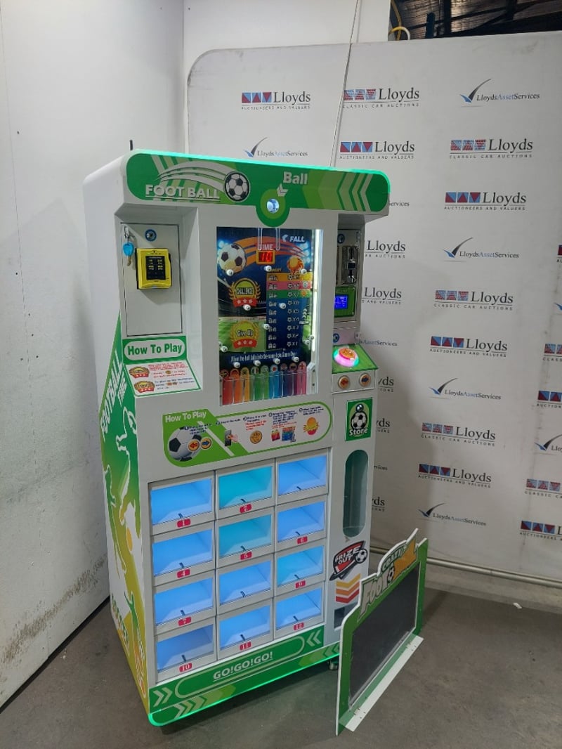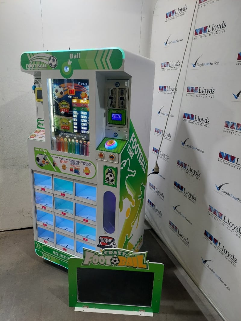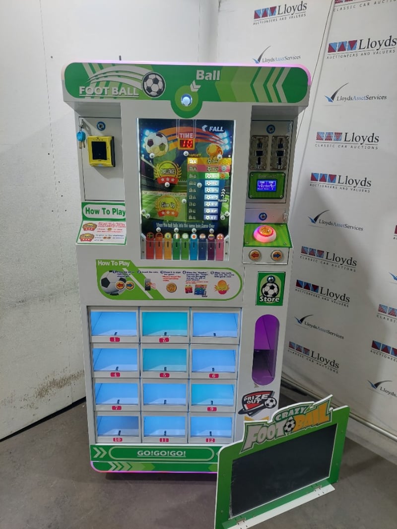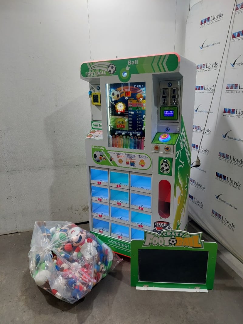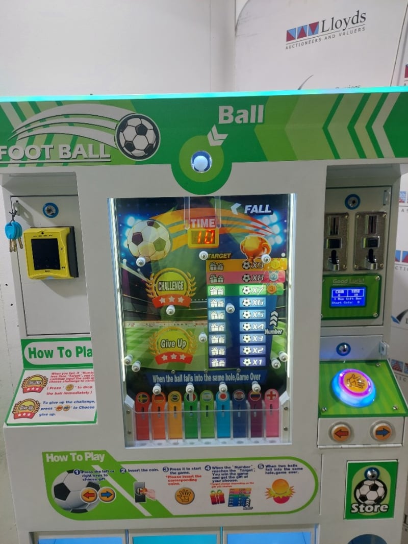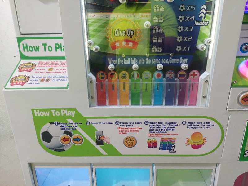 Desciption: This is a "Crazy Football" prize vending machine, also known as a drop ball game or gift machine. The game involves dropping a ball and attempting to guide it into a specific hole to win a prize, includes Super Mario plushies.