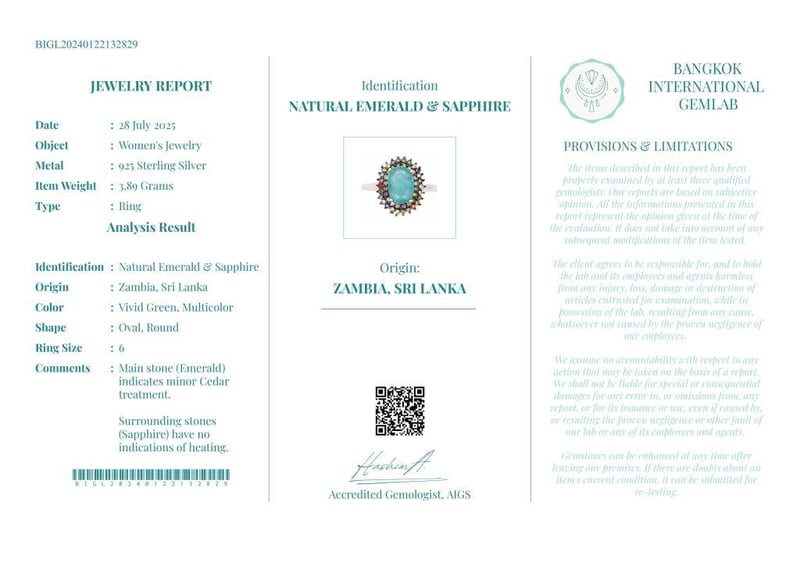 Comments : Main Stone (Emerald) Indicates Minor Cedar Treatment.