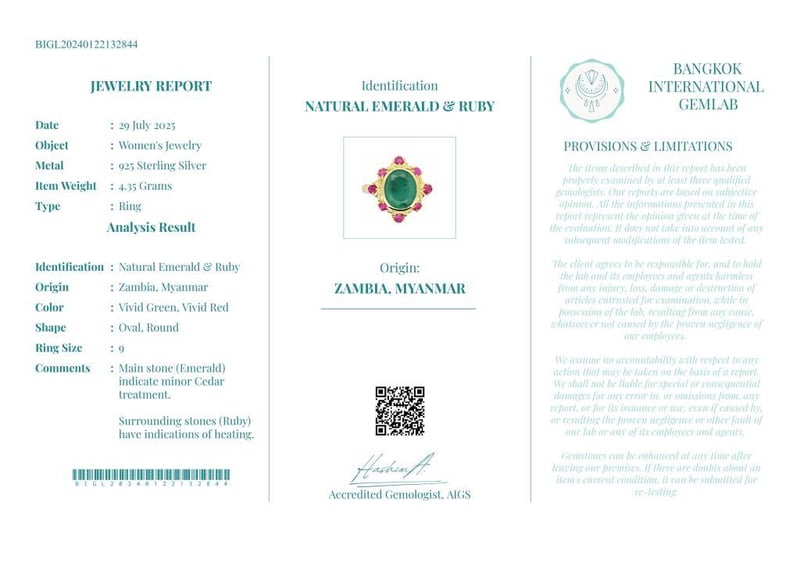 NATURAL ZAMBIAN EMERALD & BURMESE RUBY (UNHEATED) RING ON 925 SILVER - WITH CERTIFICATE Gemstone : Natural Zambian Emerald & Burmese Ruby (Unheated)Certificate Number : Bigl20240122132844Item Total Weight : 4.35 GramsMain Stone Color : Vivid Green, Vivid RedSize : 9Comments : Main Stone (Emerald) Indicate Minor Cedar Treatment.Surrounding Stones (Ruby) Have Indications Of Heating. ✻ Verify Report Online At Www.Bangkokinternationalgemlab.Co 0+25