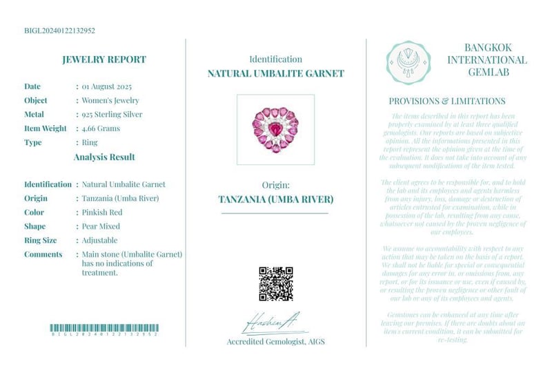 NATURAL UMBALITE GARNET (UNTREATED) RING ON 925 SILVER - WITH CERTIFICATE Gemstone : Natural Umbalite Garnet (Untreated)Certificate Number : Bigl20240122132952Item Total Weight : 4.66 GramsMain Stone Color : Pinkish RedSize : AdjustableComments : Main Stone (Umbalite Garnet) Has No Indications Of Treatment. ✻ Verify Report Online At Www.Bangkokinternationalgemlab.Co 0+32
