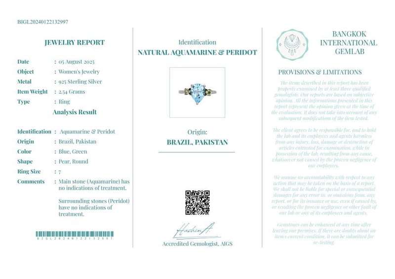 NATURAL AQUAMARINE & PERIDOT RING ON 925 SILVER - WITH CERTIFICATE Gemstone : Natural Aquamarine & PeridotCertificate Number : Bigl20240122132997Item Total Weight : 2.54 GramsMain Stone Color : Blue, GreenSize : 7Comments : Main Stone (Aquamarine) Has No Indications Of Treatment.Surrounding Stones (Peridot) Have No Indications Of Treatment. ✻ Verify Report Online At Www.Bangkokinternationalgemlab.Co 0+35