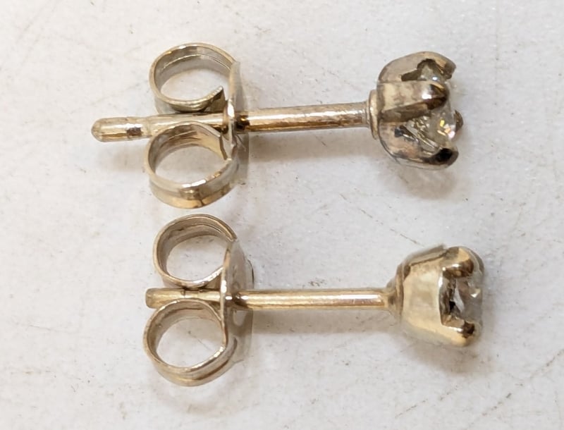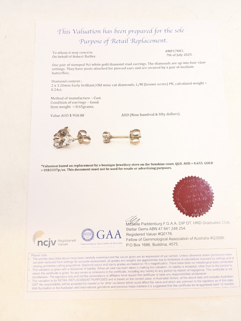9CT WHITE GOLD DIAMOND STUD EARRINGSDiamond Content:2 X 3.2 Early Brilliant/ Old Mine Cut Diamonds, L/M (Brown Series) Pk, Weight = 0.24CtTotal Item Weight: 0.65gCondition: Good - Refer To ImagesThis valuation has been conducted by an independent third-party professional. The valuation amount is an assessment by the issuing valuer and does not reflect the auction value of the item.Any inquiries regarding the valuation should be directed to the issuing valuer (refer to contact details on the certificate), as Lloyds Auctions has no affiliation or influence over the valuation, the valuer, or the stated amount.Insurance Replacement Valuation Amount: $950.00585025+54