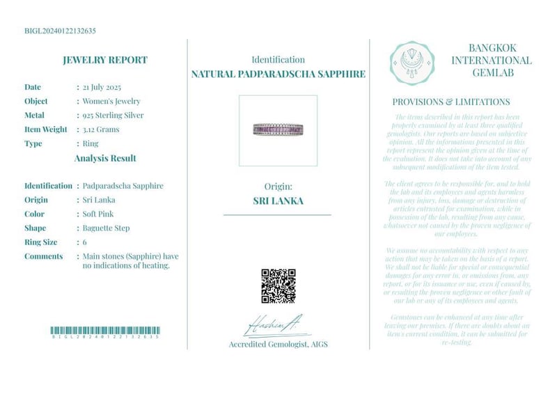 NATURAL PADPARADSCHA SAPPHIRE (UNHEATED) RING ON 925 SILVER - WITH CERTIFICATE Gemstone : Natural Padparadscha Sapphire (Unheated)Certificate Number : Bigl20240122132635Item Total Weight : 3.12 GramsMain Stone Color : Soft PinkSize : 6Comments : Main Stones (Sapphire) Have No Indications Of Heating. ✻ Verify Report Online At Www.Bangkokinternationalgemlab.Co 0+11