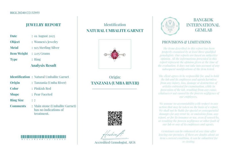 NATURAL UMBALITE GARNET (UNTREATED) RING ON 925 SILVER - WITH CERTIFICATE Gemstone : Natural Umbalite Garnet (Untreated)Certificate Number : Bigl20240122132955Item Total Weight : 2.05 GramsMain Stone Color : Pinkish RedSize : 7Comments : Main Stone (Umbalite Garnet) Has No Indications Of Treatment. ✻ Verify Report Online At Www.Bangkokinternationalgemlab.Co 0+32