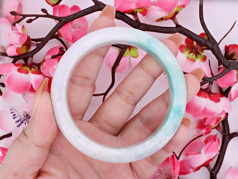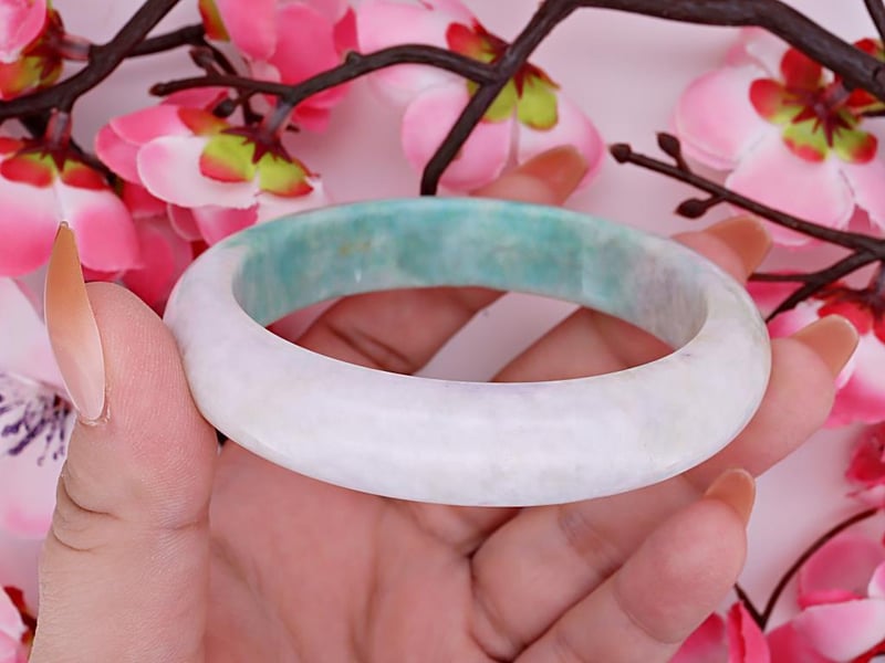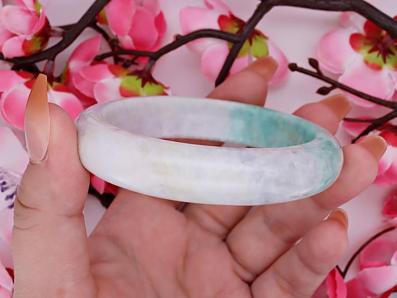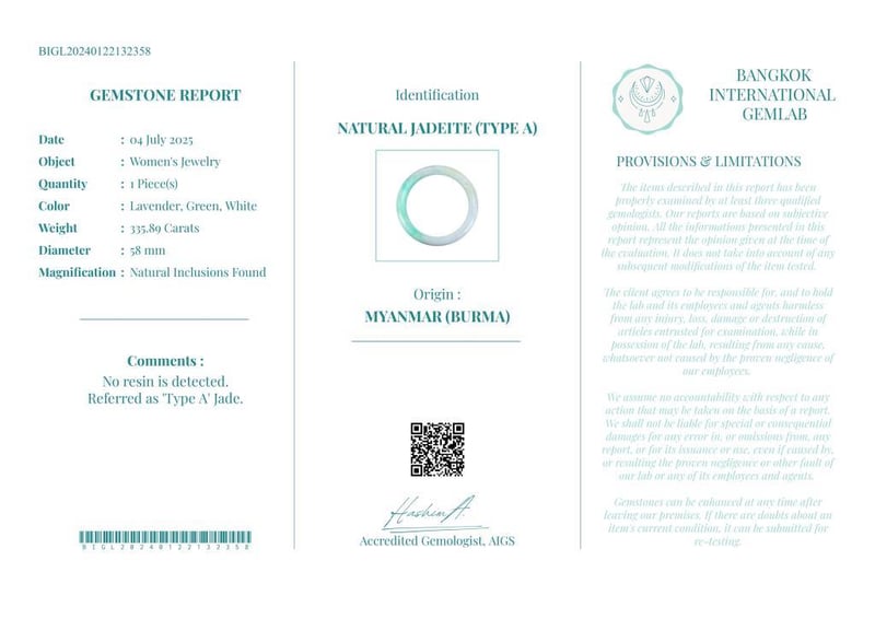 NATURAL BURMESE JADE BANGLE - WITH CERTIFICATE Gemstone : Natural Burmese JadeCertificate Number : Bigl20240122132358Item Total Weight : 335.89 GramsMain Stone Color : Lavender, Green, WhiteSize : 58Comments : No Resin Is Detected.Referred As 'Type A' Jade. ✻ Verify Report Online At Www.Bangkokinternationalgemlab.Co 0+4