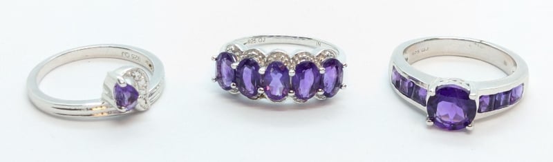 THREE AMETHYST STERLING SILVER RINGS