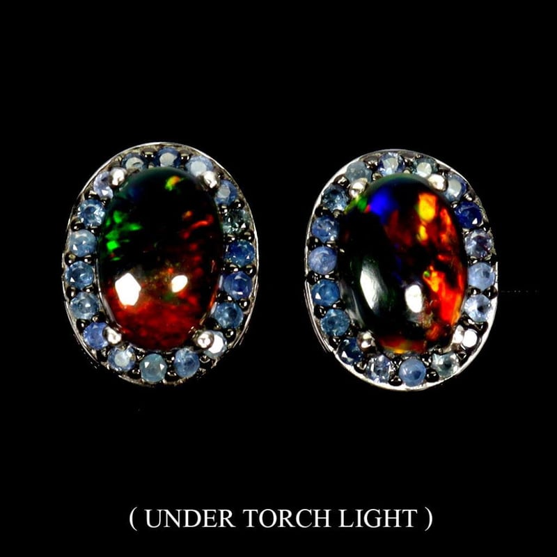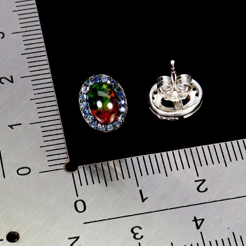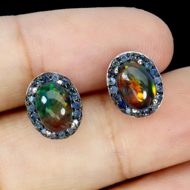 Natural Diamond Cut Sapphires And Rainbow Opal Earrings. Made In Solid Sterling Silver And Plated In14K White Gold. Features Natural Diamond Cut Blue Sapphires And Natural Rainbow Fire Opals. Earrings Measure 9X7Mm.