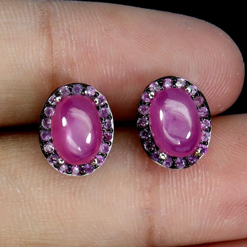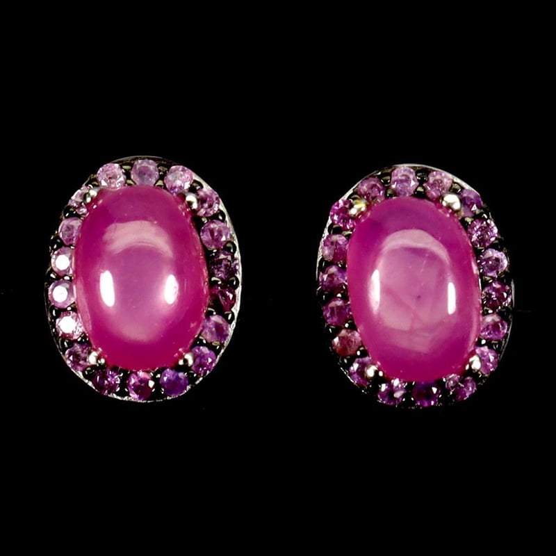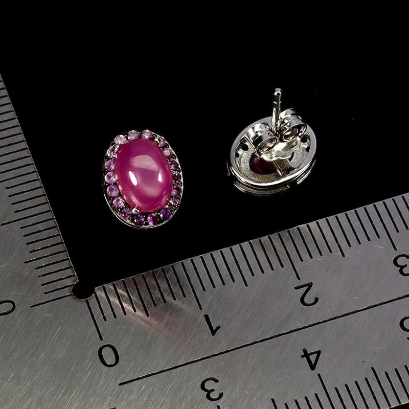 Natural Ruby Earrings. Made In Solid Sterling Silver And \Plated In 14K White Gold. Features Natural Oval Cabochon Pink Rubies And Natural Diamond Cut Rubies. Earrings Measure 10X8Mm