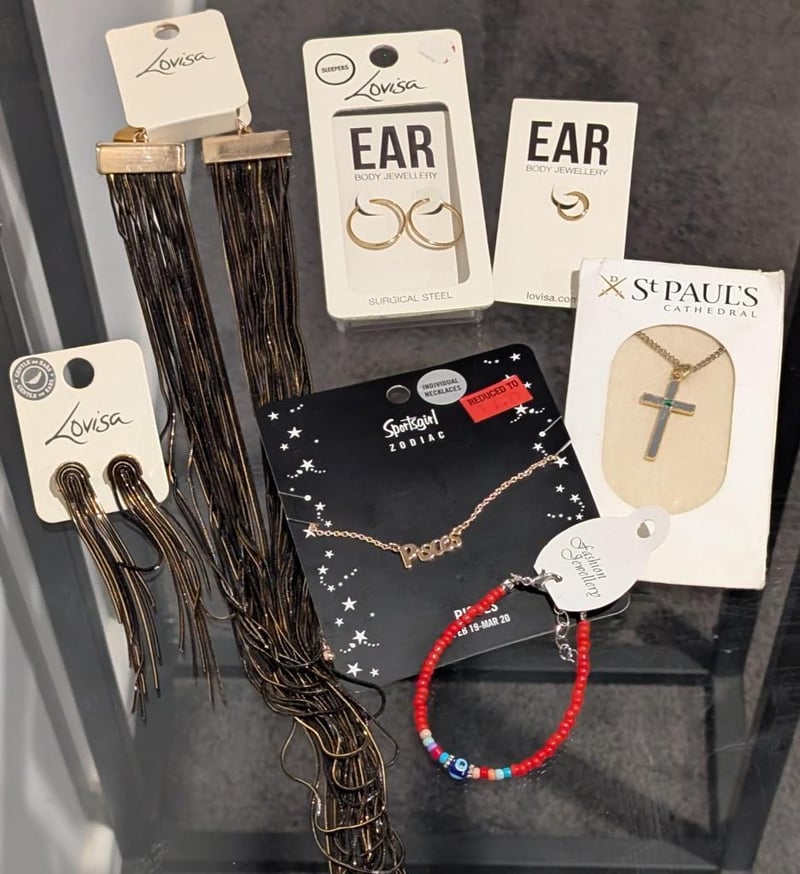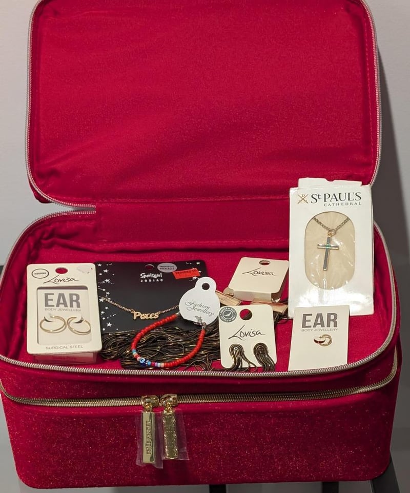 Estee Lauder Red Velvet dual compartment makeup bag, with various costume jewellery and hair accessories Condition: New