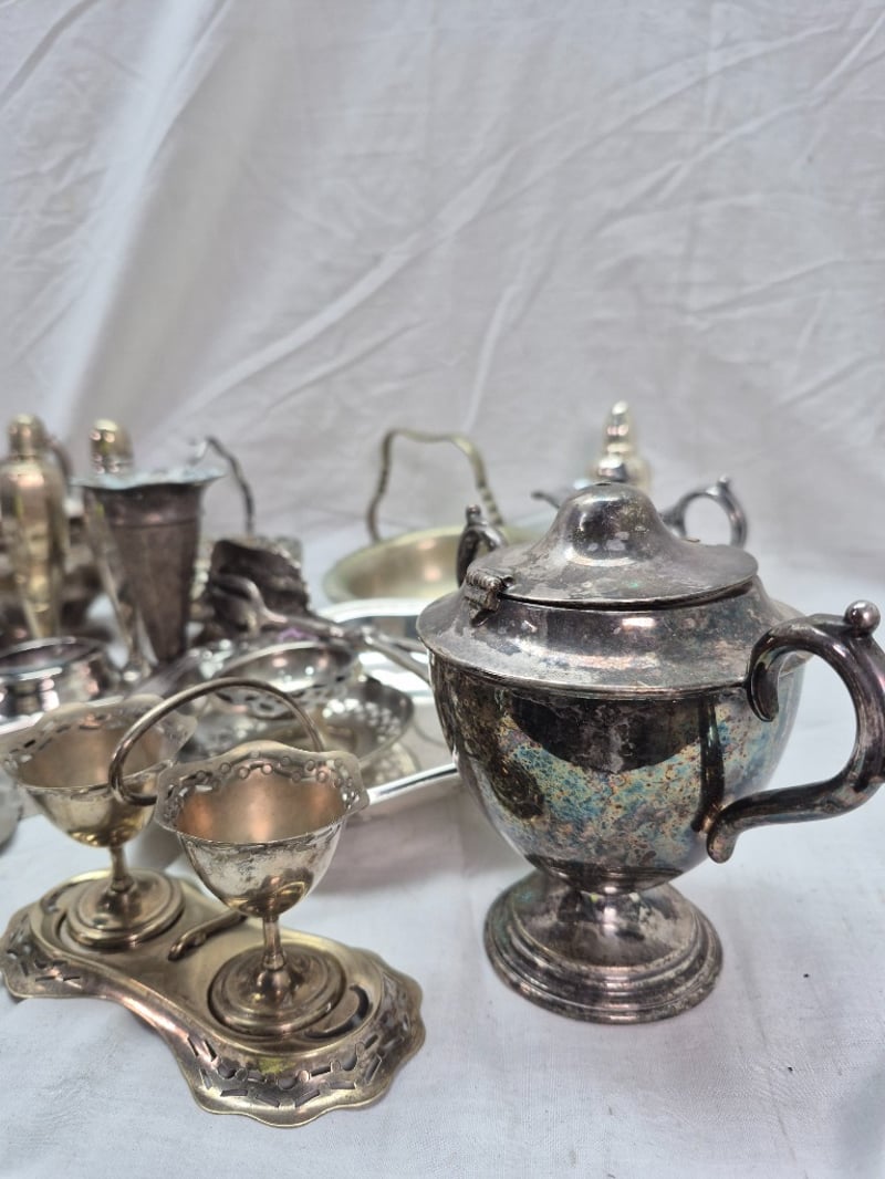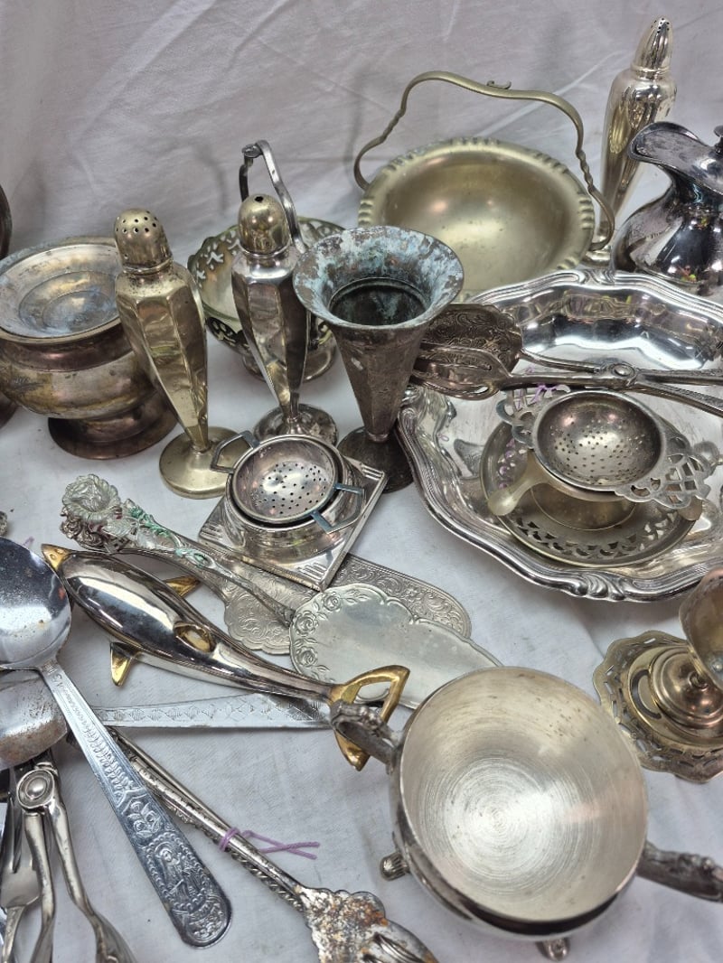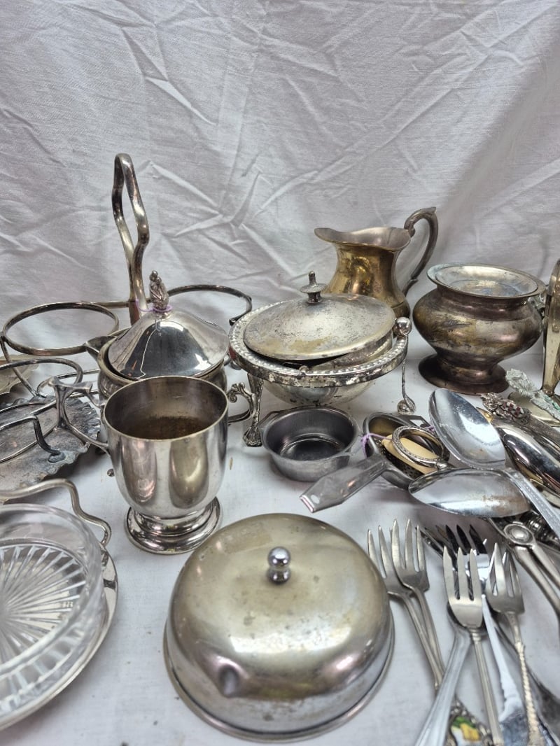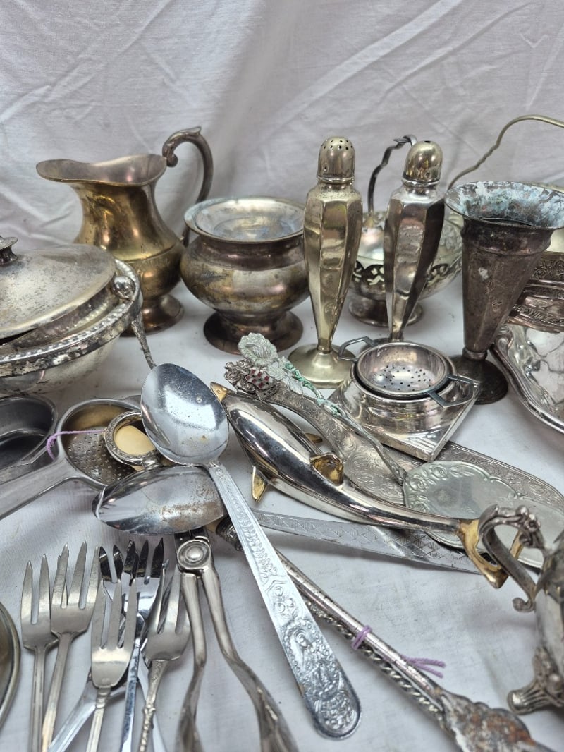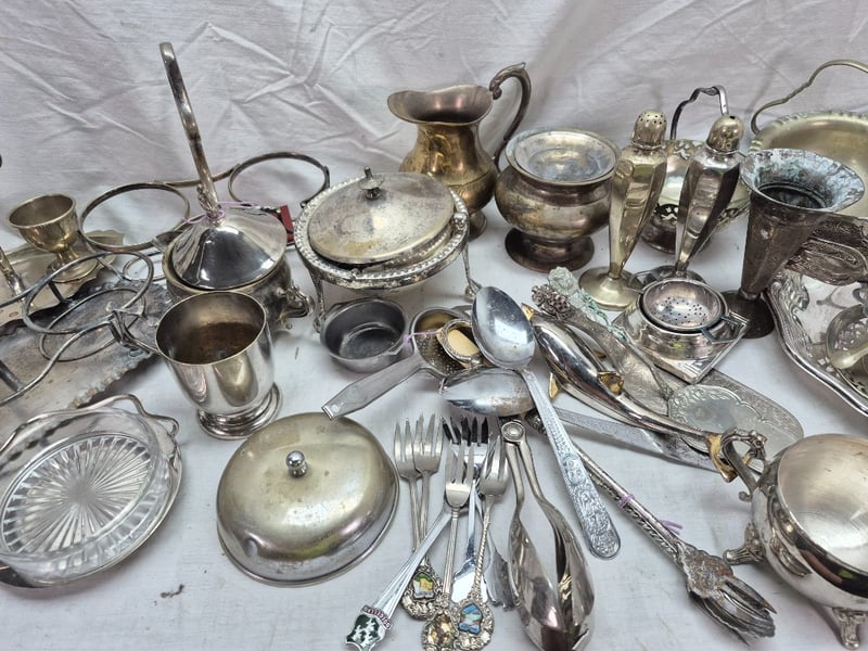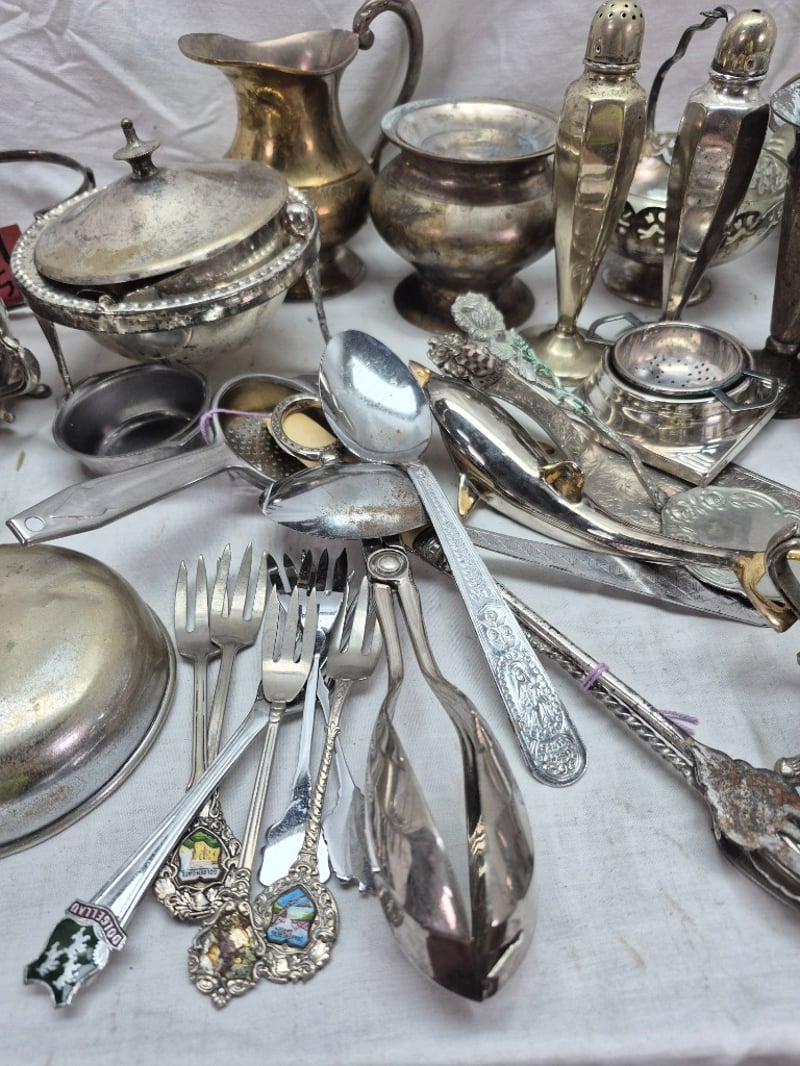 Approximately 50+ Pieces Of Silver & Pewter Serving Utensils, And Decorative Tableware Including Teapots, Covered Tureens, Sugar Bowls, Creamers, Salt And Pepper Shakers, Serving Spoons, Forks And More