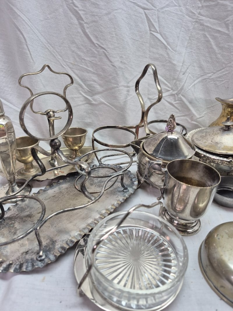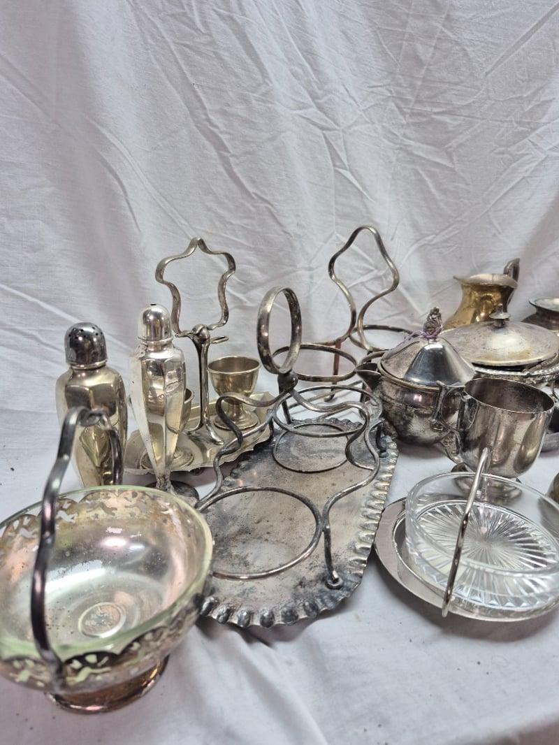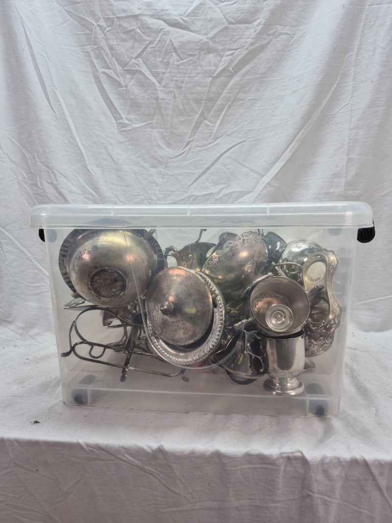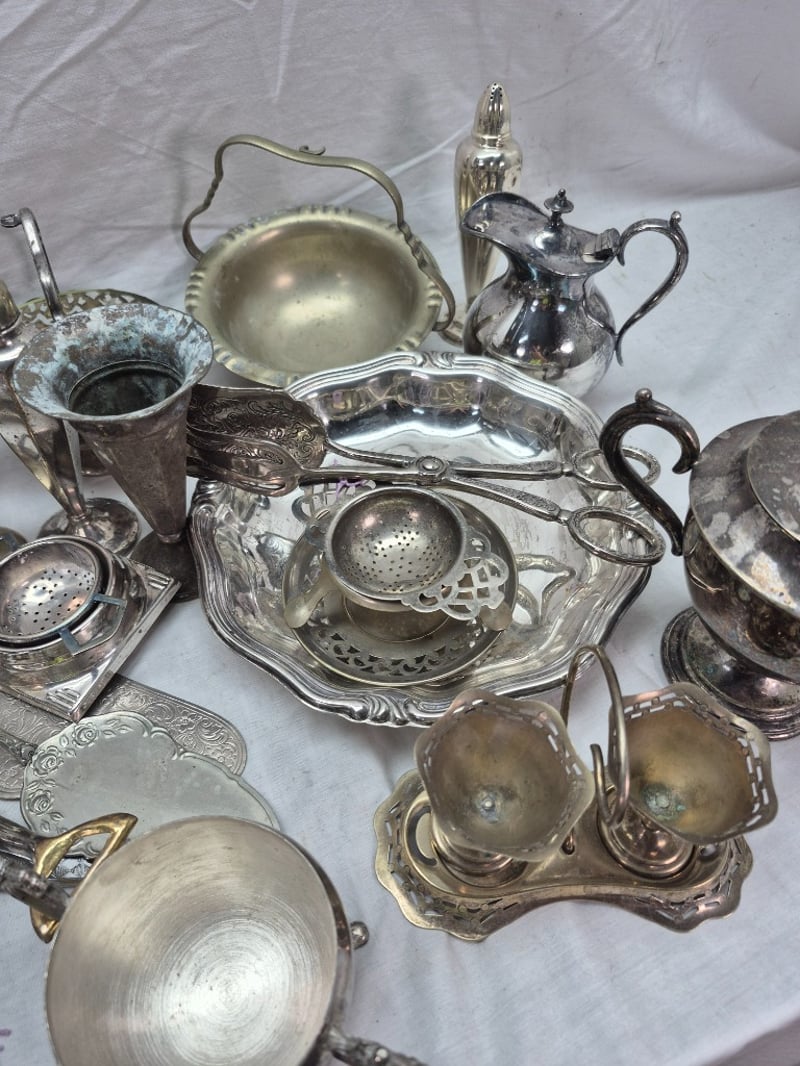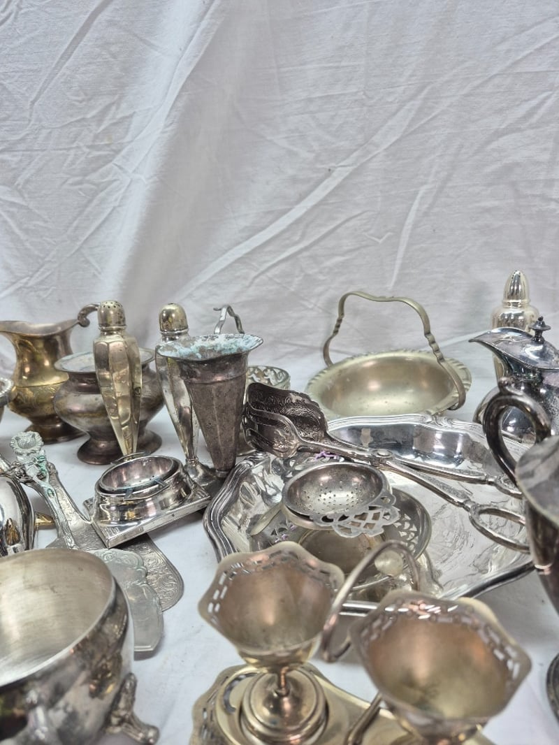 Approximately 50+ Pieces Of Silver & Pewter Serving Utensils, And Decorative Tableware Including Teapots, Covered Tureens, Sugar Bowls, Creamers, Salt And Pepper Shakers, Serving Spoons, Forks And More