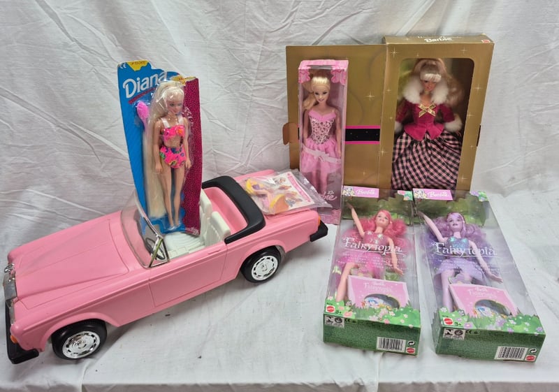 BARBIE DOLL COLLECTION WITH PINK CONVERTIBLEOriginal Diana Doll In Floral Swimwear With Pink Brush, Classic Pink Convertible With Opening Doors And Detailed Interior, Winter Rhapsody Special Edition Avon Exclusive In Burgundy Plaid Ensemble With White Fur Trim, Fairytopia Sparkle Fairy Dolls In Pink And Purple DressCondition: Good - Refer To Images587756+2