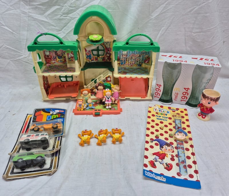 CABBAGEPATCH PLAYHOUSE AND FIGURINES, NODDY WATCH AND EGG CUP & DICAST CARS