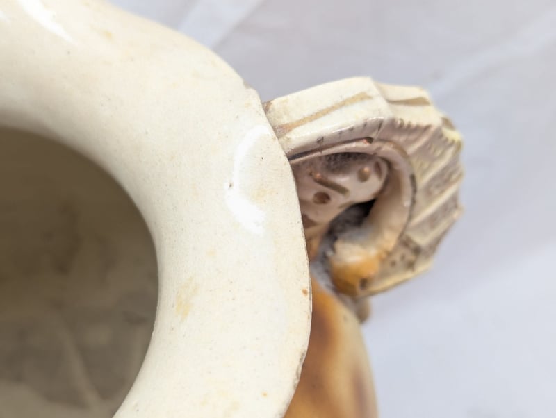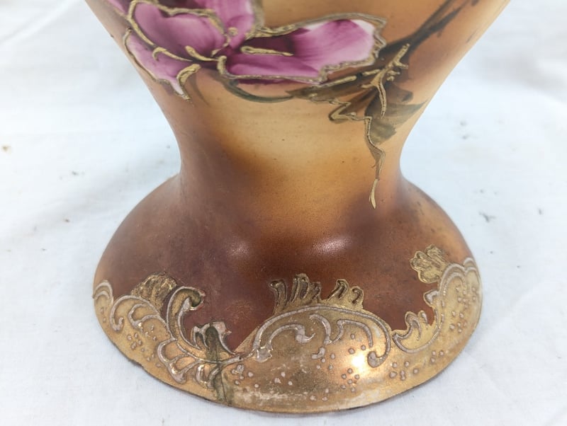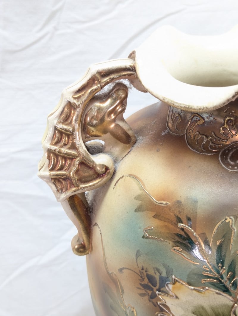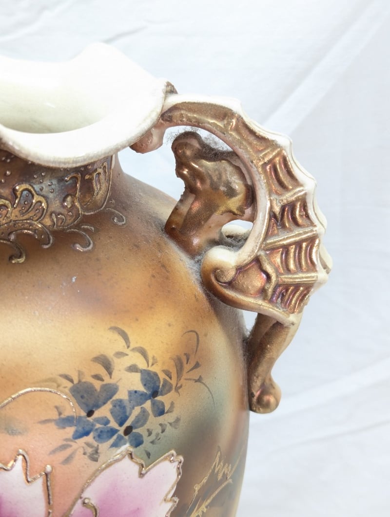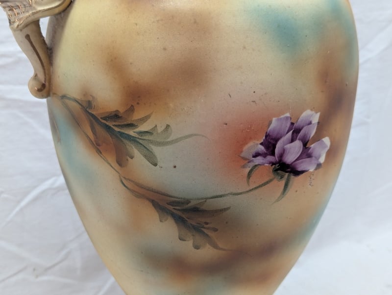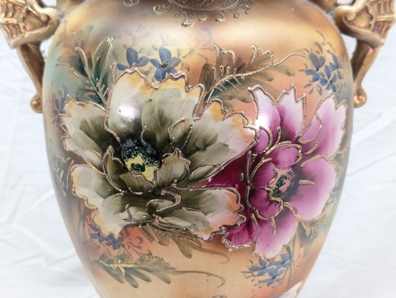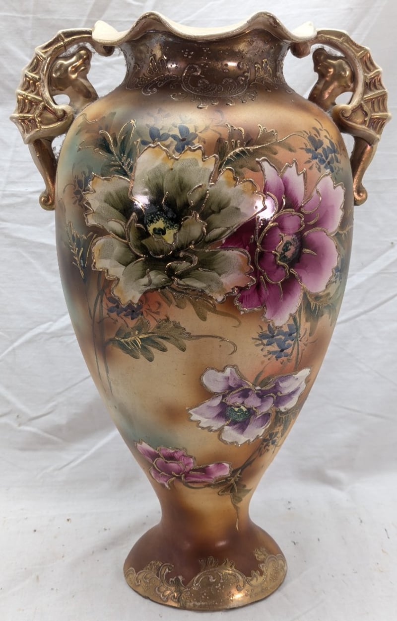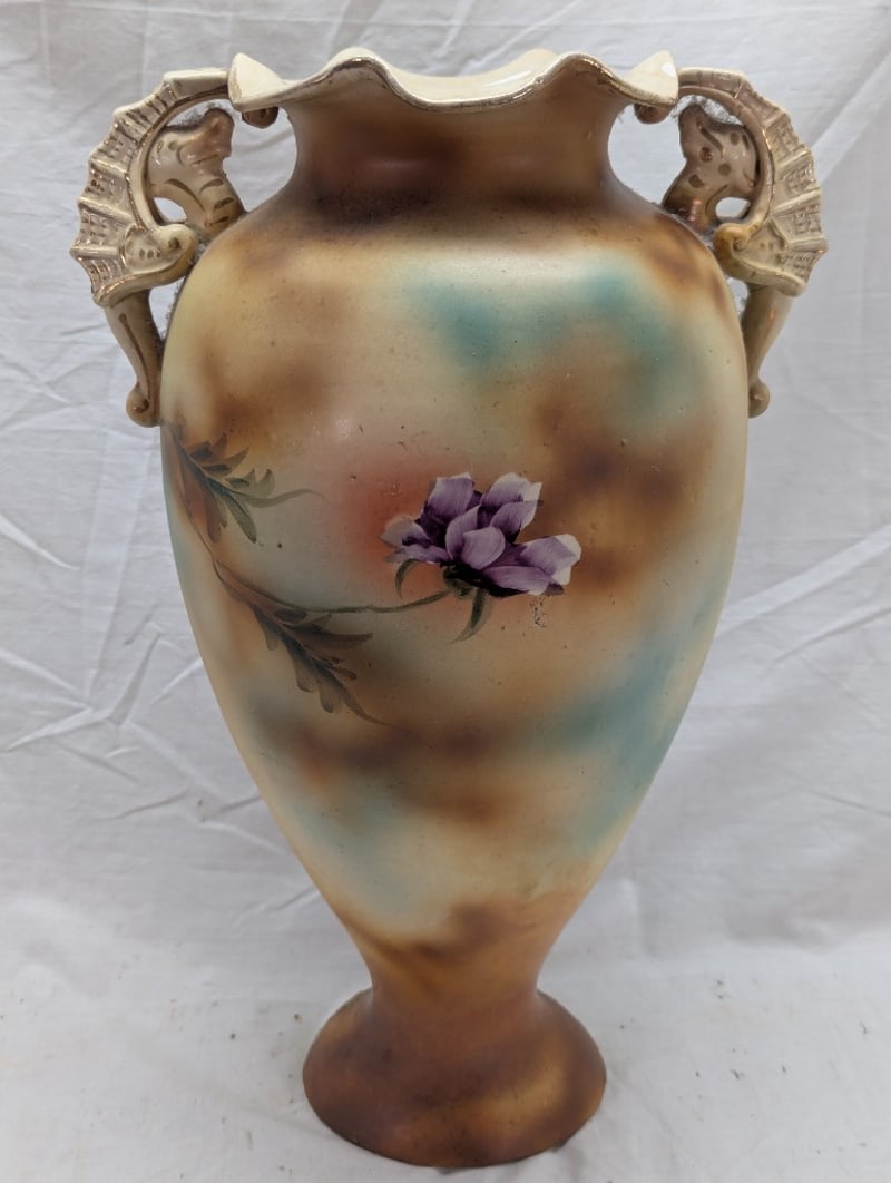 Vase Features Painted Exterior With Floral Design, Dual Sea Horse Style Handles, Floral Design With Faux Gold Paint Outlines