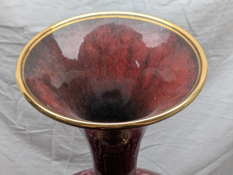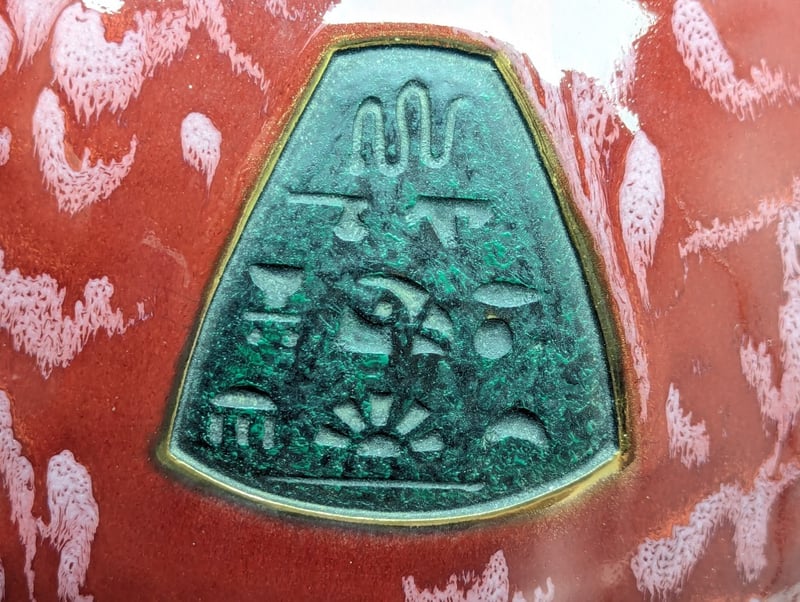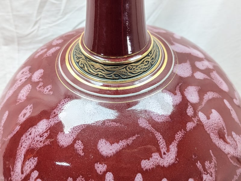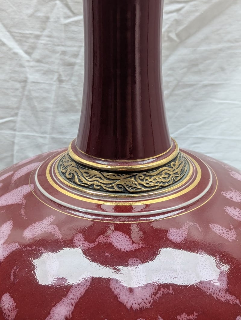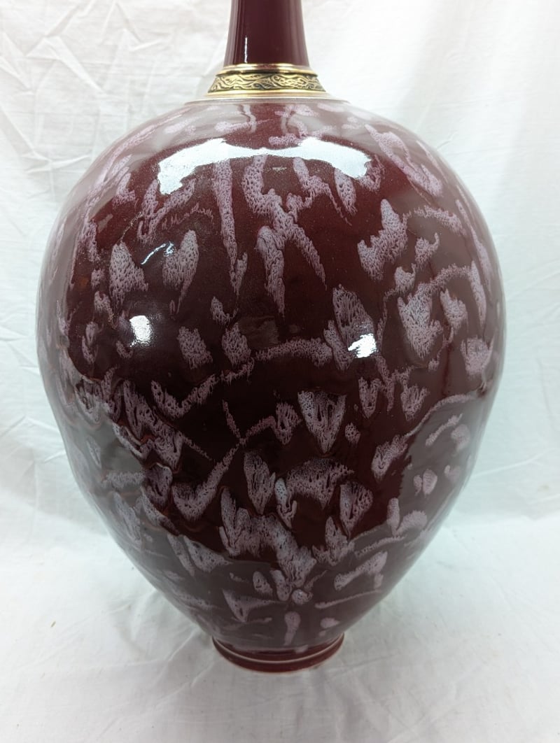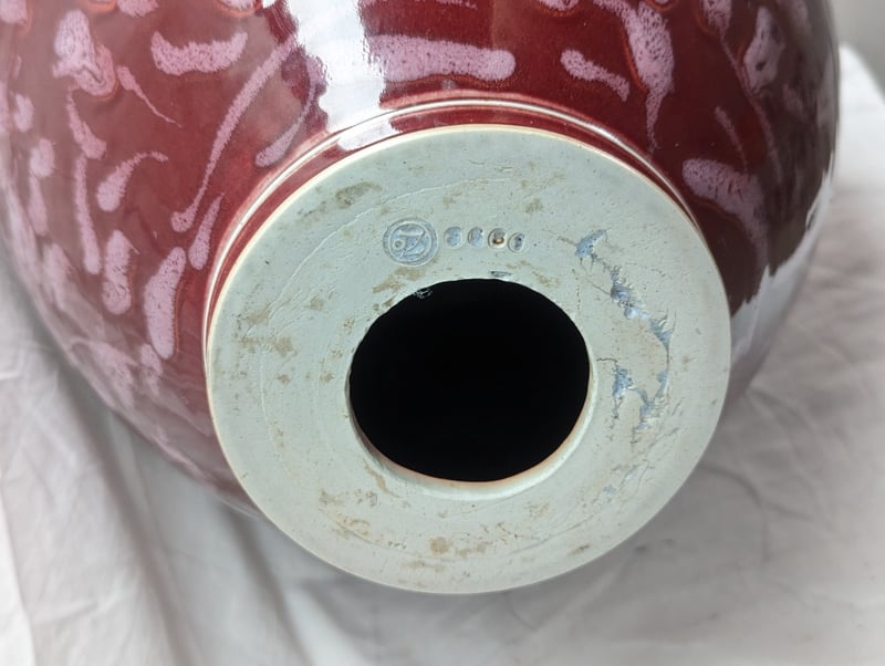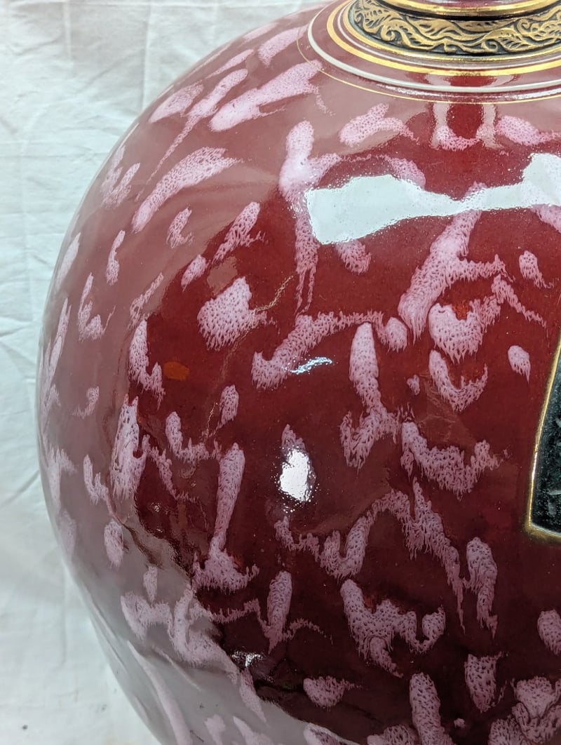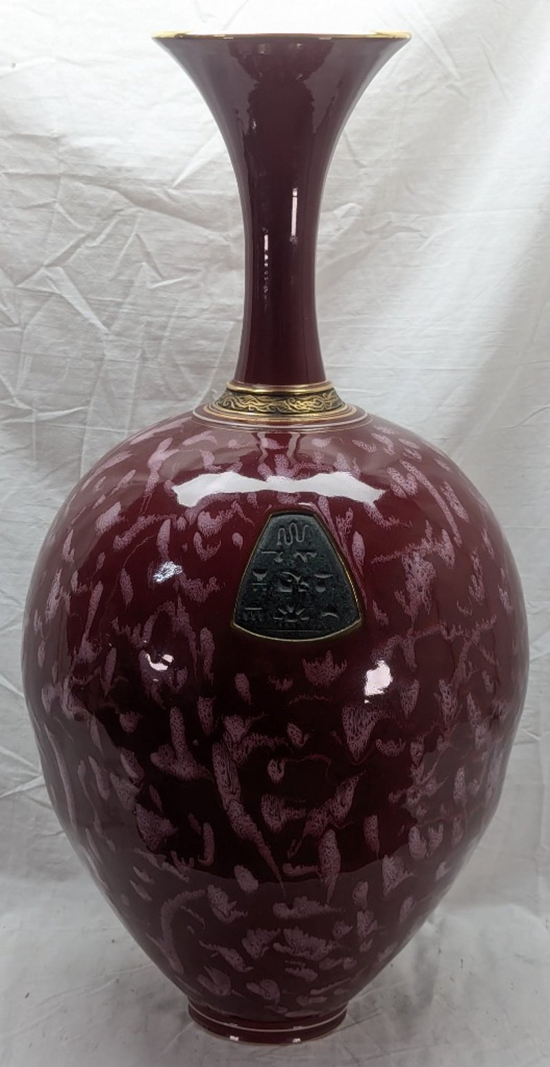 JAPANESE DECORATIVE VASE Item Size: Height: 80cm, Width: 40cm, Depth: 40cm Red Exterior With White Marks, Metal Badge With Symbols On Vase Front, Ring With Floral Style Design Around Base Of Vase Neck, Faux Gold Ring Around Rim Of Vase, Interior Vase Features Hard Wood Style Design Condition: Good - Refer To Images 13B 586295+1