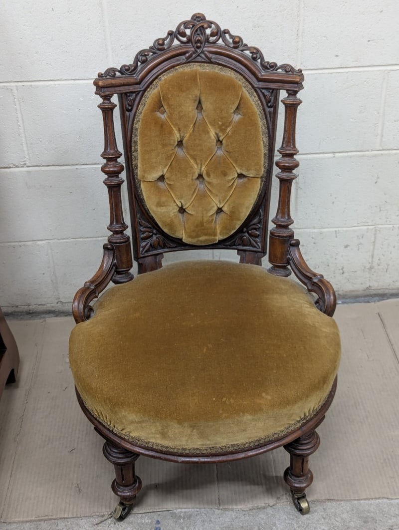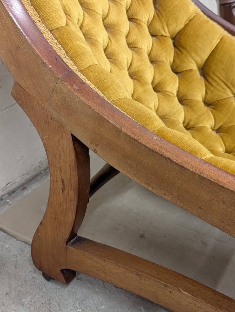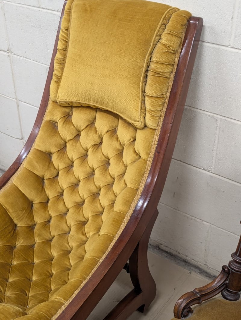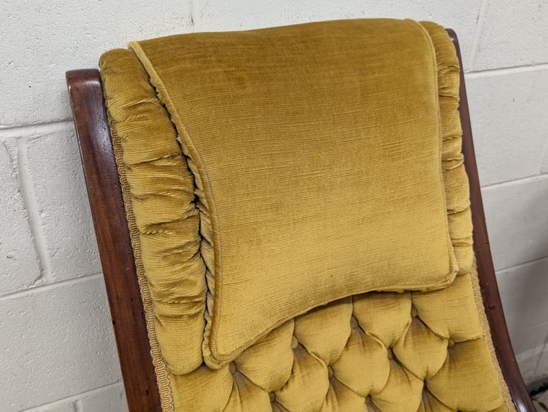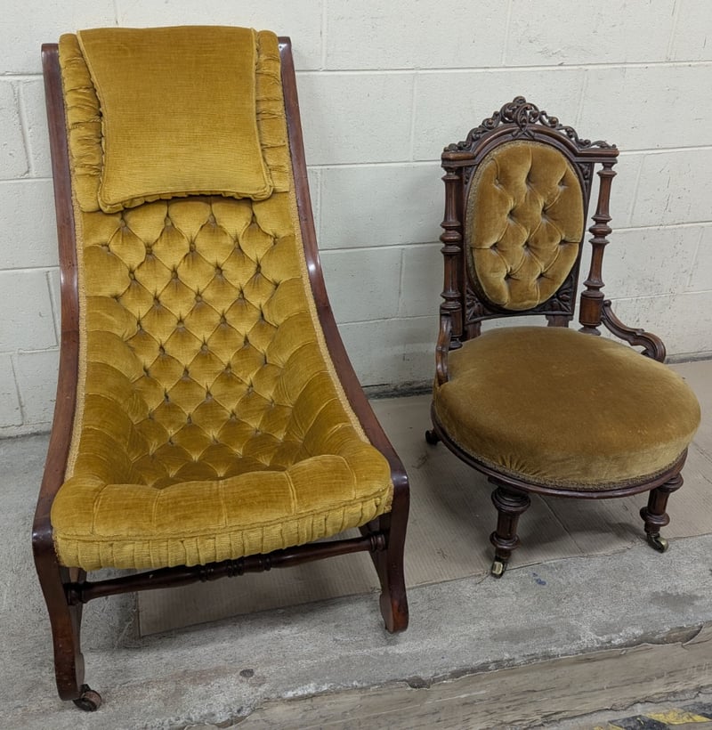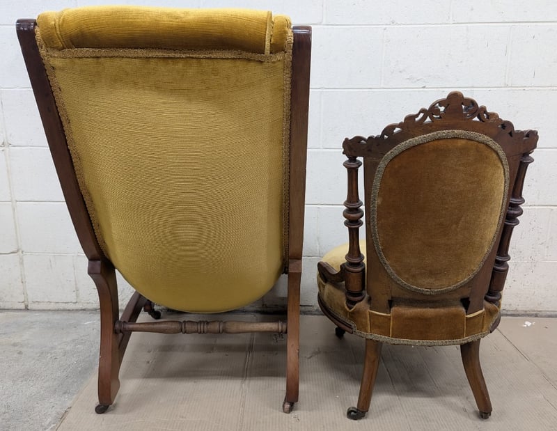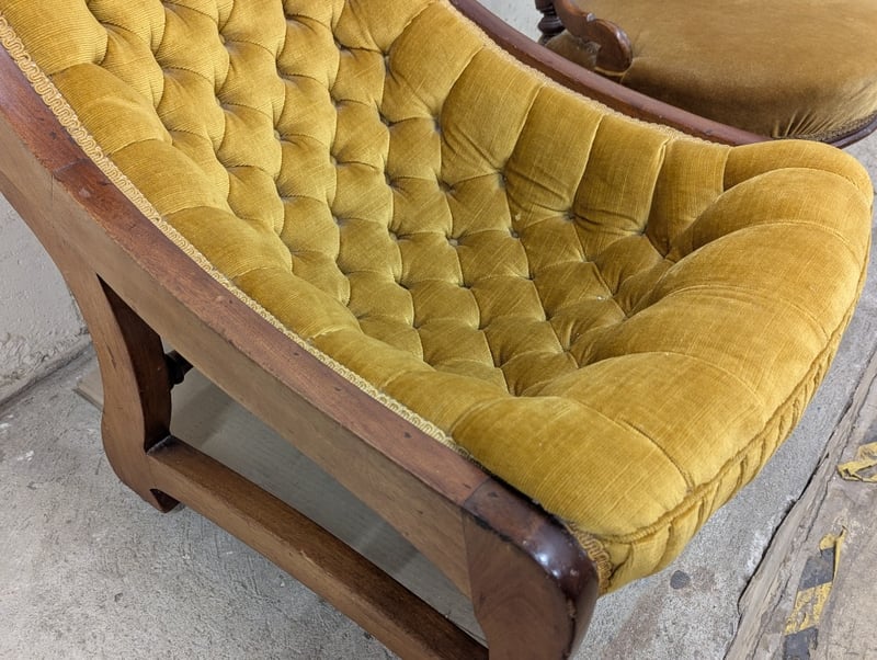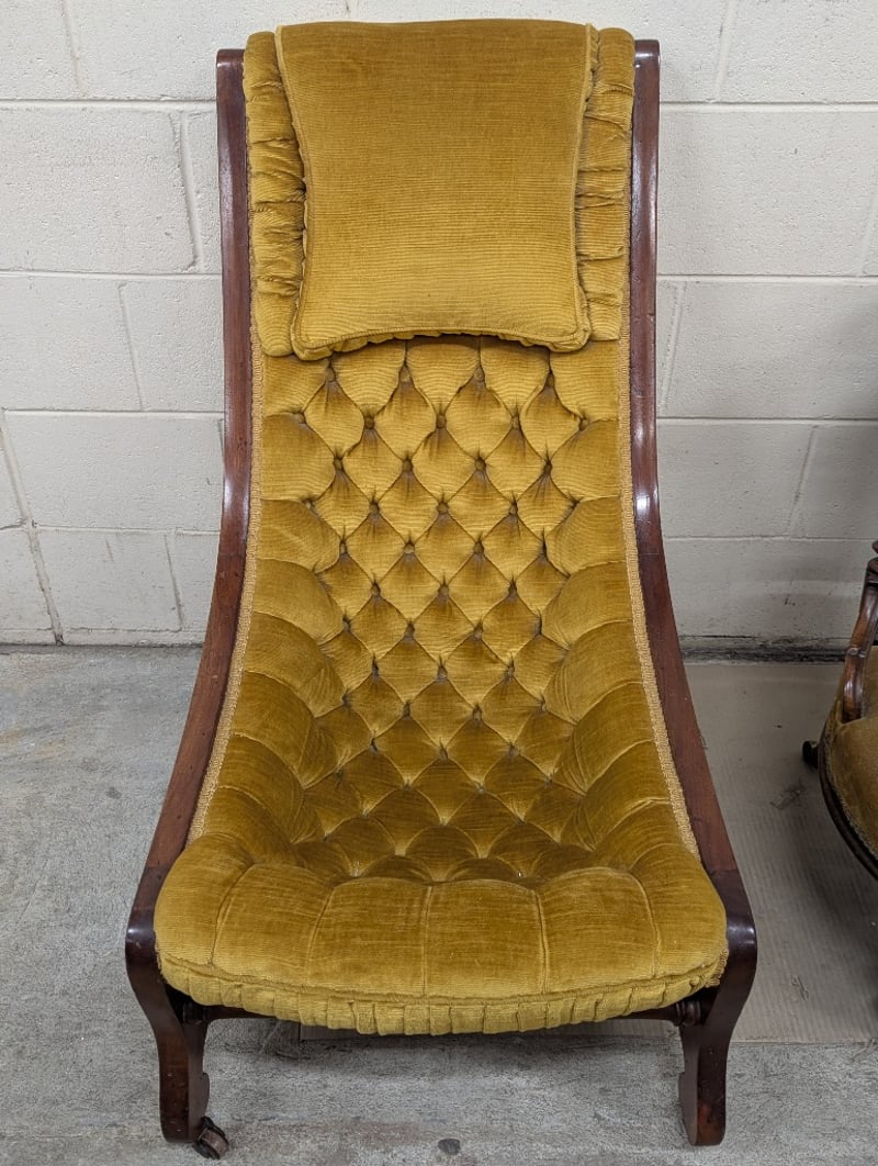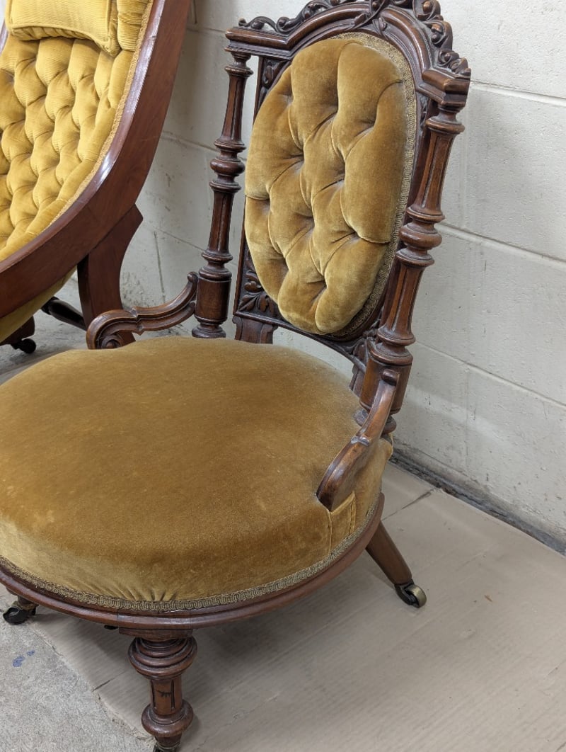 Timber Construction, Yellow Cushioned Upholstery, One Chair Features Deep Base With Concaved Seat, One Chair Features Carved Timber With Ornate Design, Both Chairs Feature Four Casters,