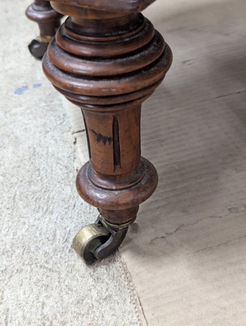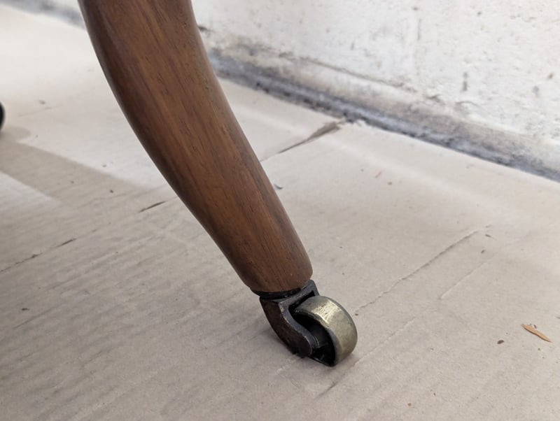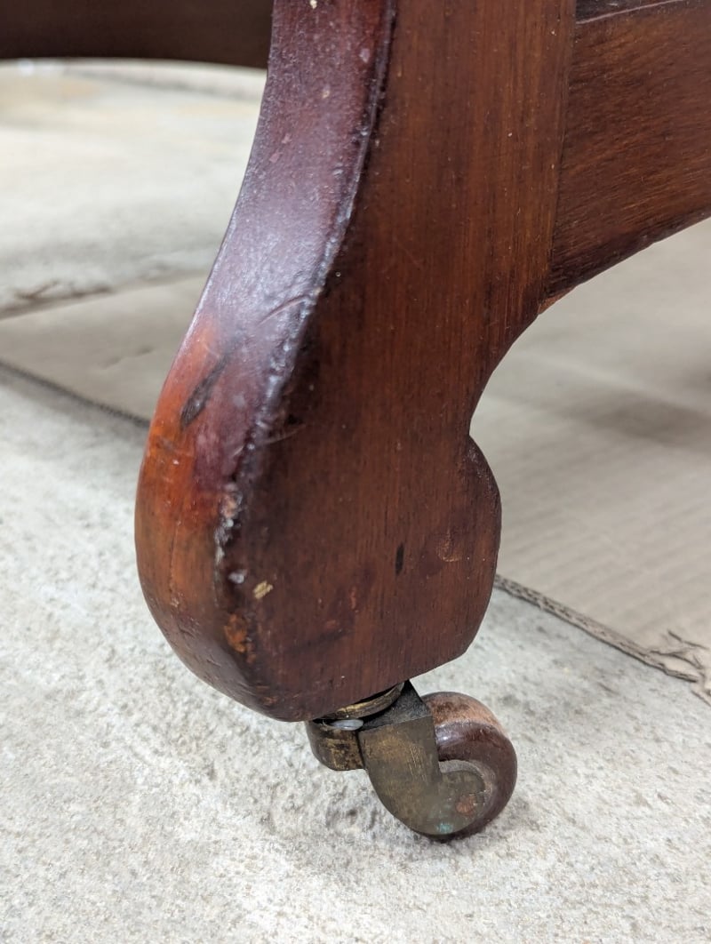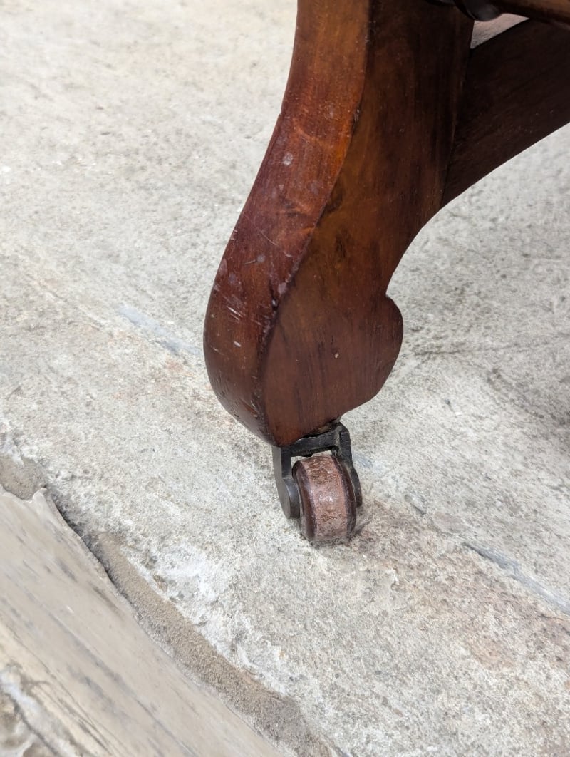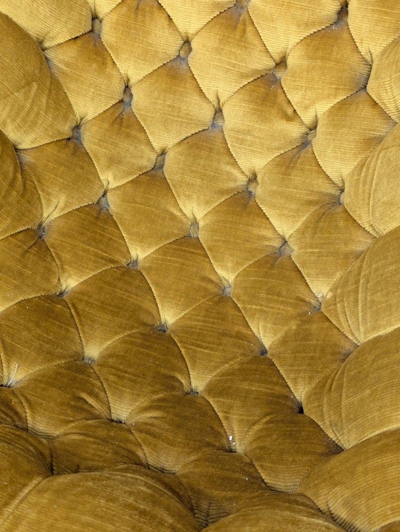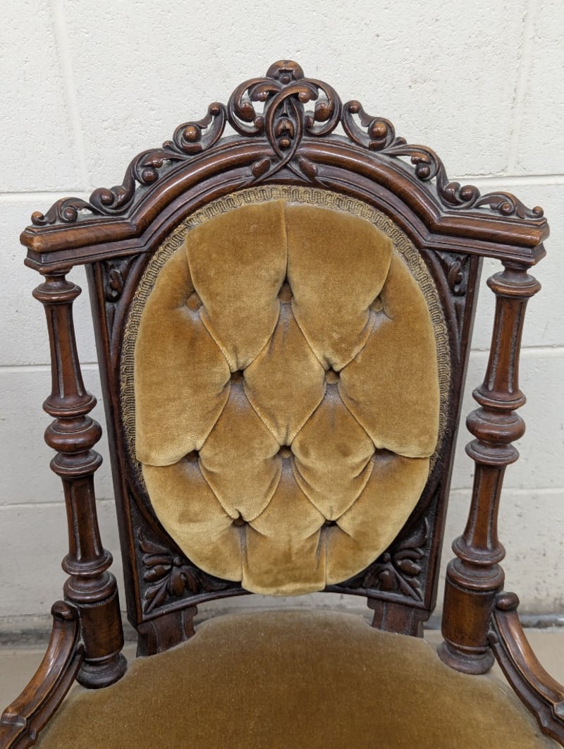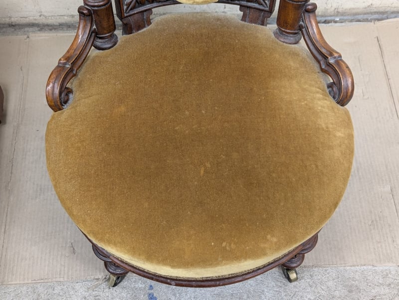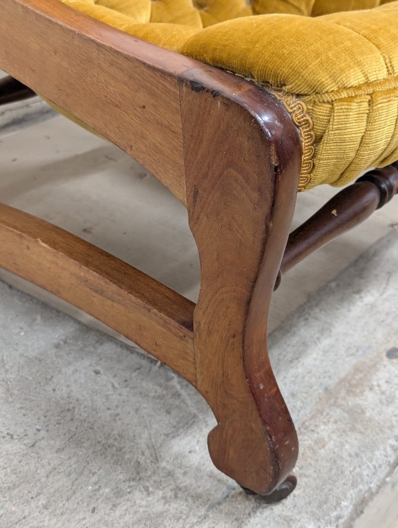 Timber Construction, Yellow Cushioned Upholstery, One Chair Features Deep Base With Concaved Seat, One Chair Features Carved Timber With Ornate Design, Both Chairs Feature Four Casters,