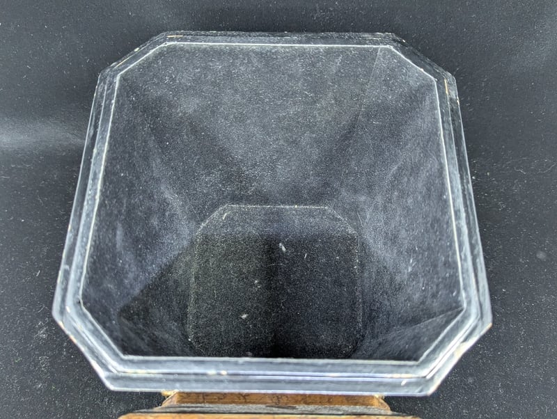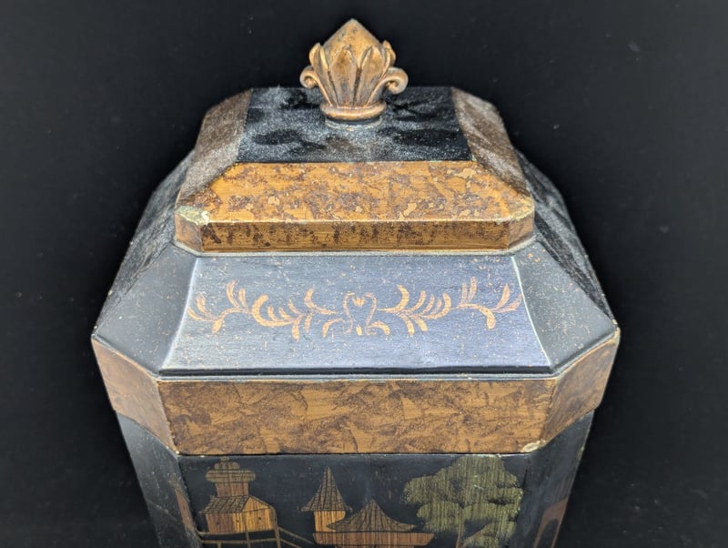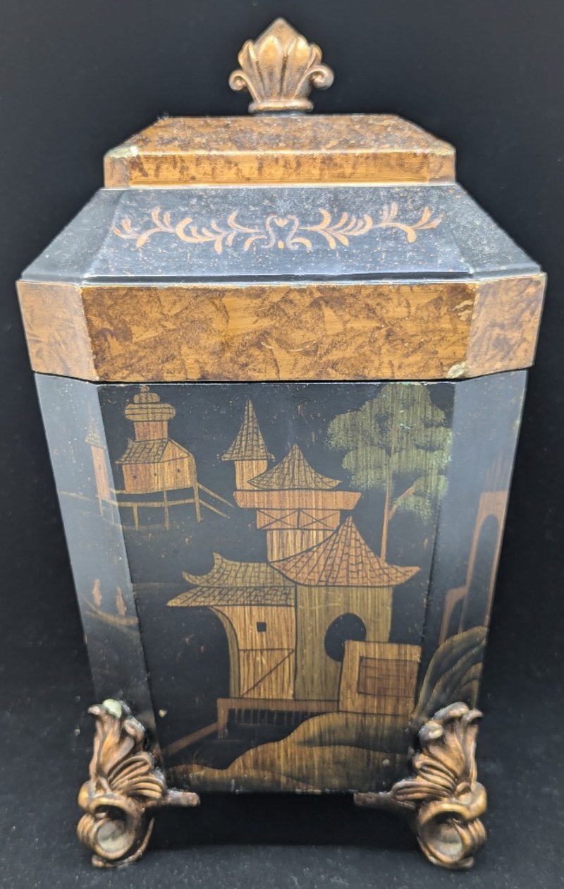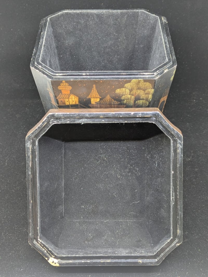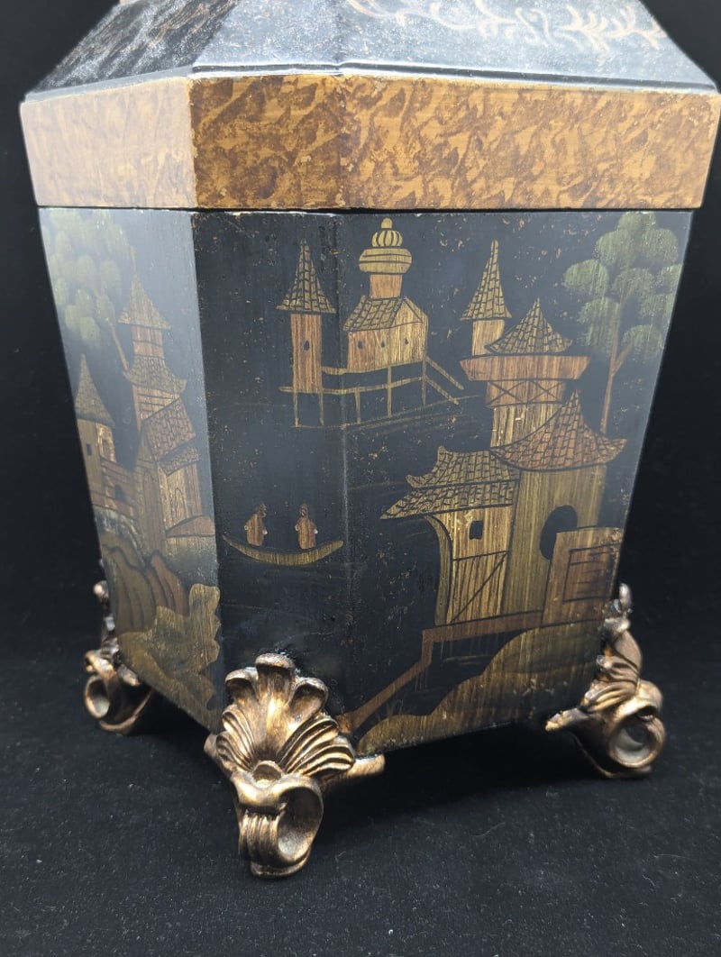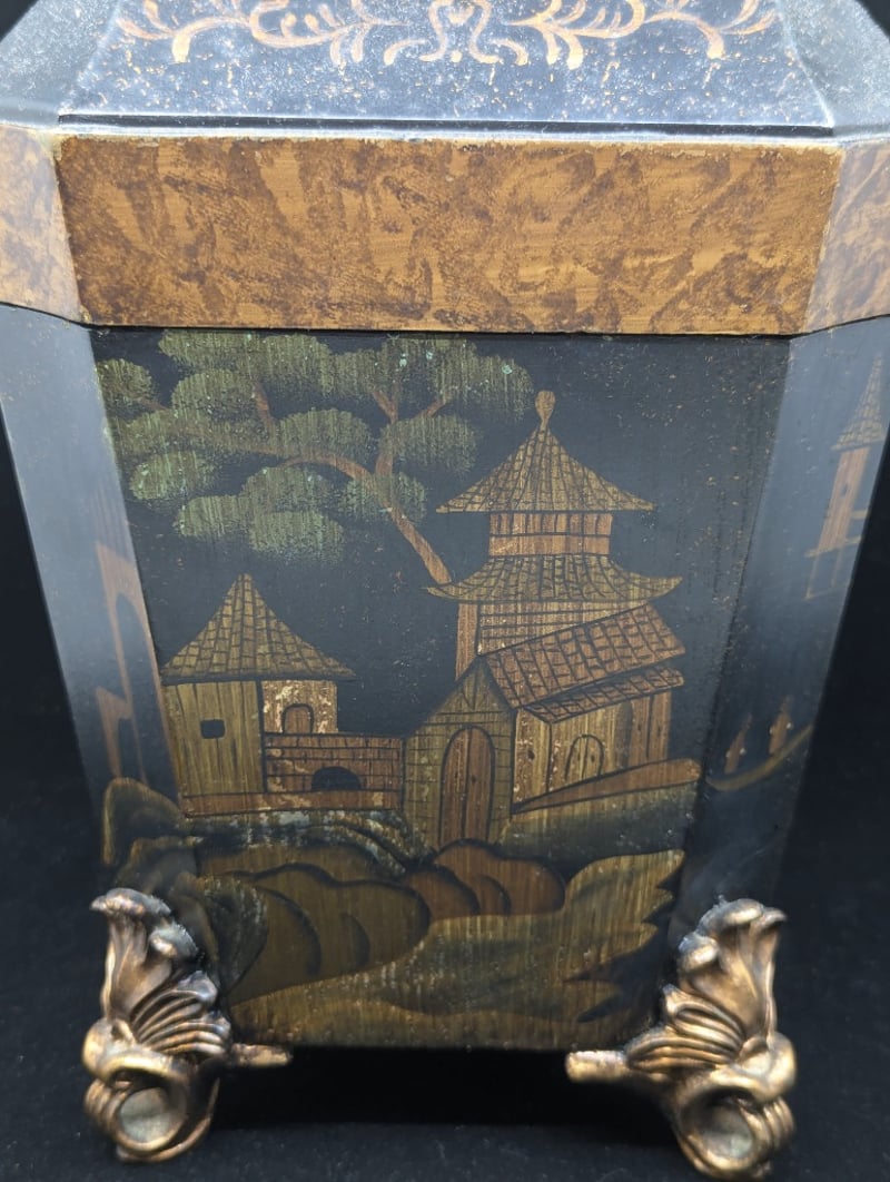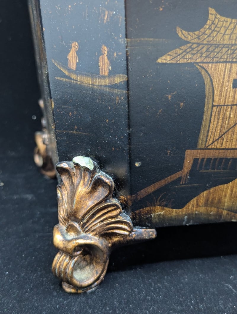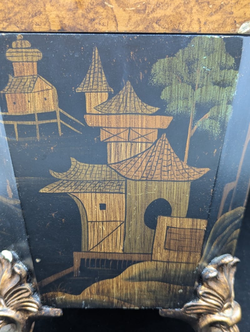 Timber Construction, Black Exterior With Chinese Village Style Imagery, Four Legs, Lid Features Floral Style Design Around Exterior