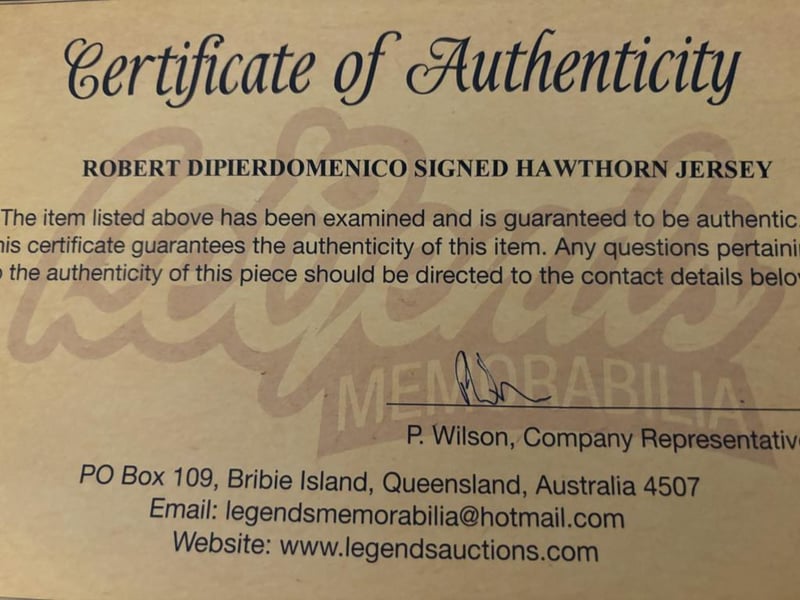 Robert Diperdimenico Personally Signed Hawthorn Hawks Guernsey. The Guernsey Is Size L. The Item Is Accompanied By A Certificate Of Authenticity.