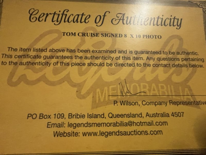 TOM CRUISE SIGNED 'MISSION IMPOSSIBLE'Tom Cruise Personally Signed 'Mission Impossible' 8 X 10 Photo. The Item Is Accompanied By A Certificate Of Authenticity.Size: 25 x 20 x 10Condition: Good - Refer To Images585033+41