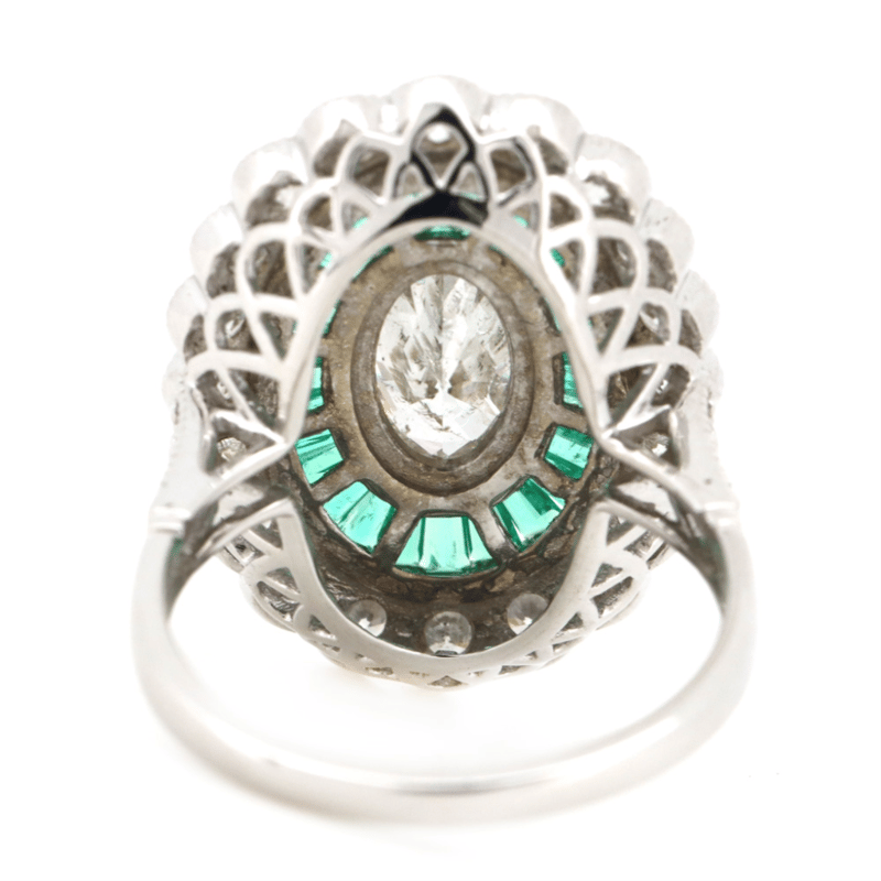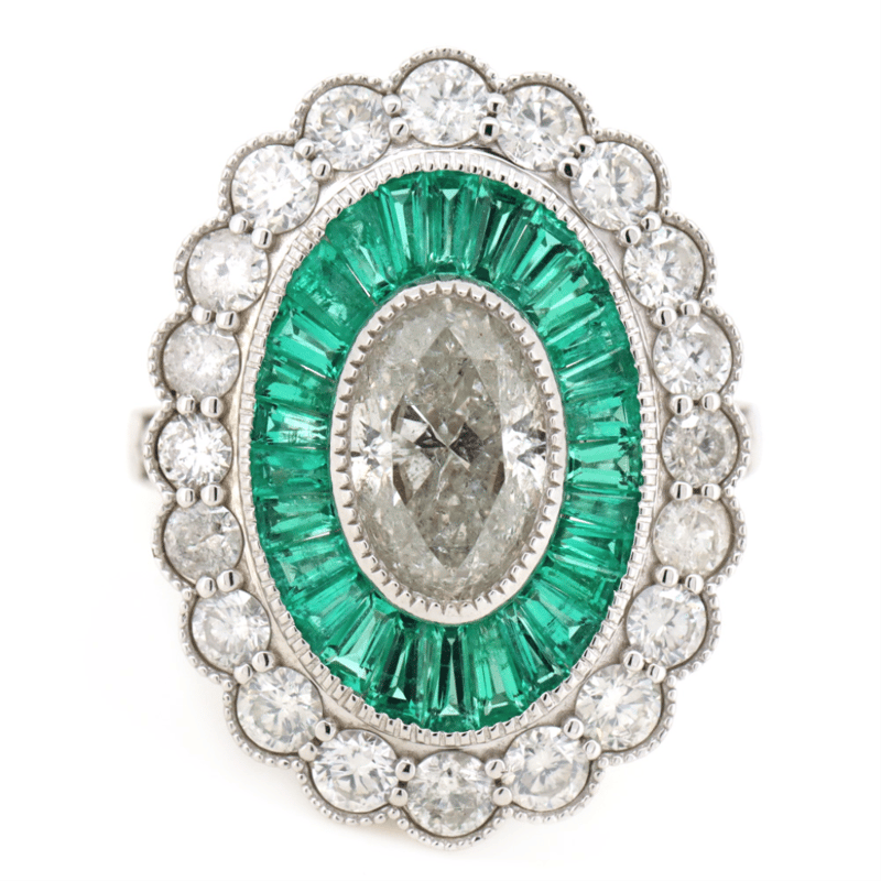 The Centre Features, One Oval Mixed Brilliant Cut, Diamond (1.50Ct, G-H Colour, P2 Clarity), Bezel Set With Millgrain Detail. Surrounding The Centre Are, 27 Baguette Cut, Moderate Vivid Green, Colombian Emerald (1.16Ct Tsw, Slightly Included), Channel Set. Accompanied With 26 Round Brilliant Cut, Diamonds (1.46Ct, H-K Colour, Si1-Si2 Clarity), Bead Set With Millgrain Detail. Ring Size N 1/2.