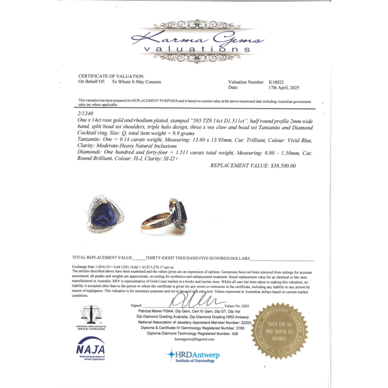 This Insurance Valuation has been provided by a registered Jewellery Valuer and is intended for insurance purposes only. The valuation amount has no bearing on the auction value of the item. Any questions regarding the valuation should be directed to the issuing Valuer (refer to contact details on the certificate) as Lloyds have no association or relationship with the Valuer or the valuation amount contained within the valuation.