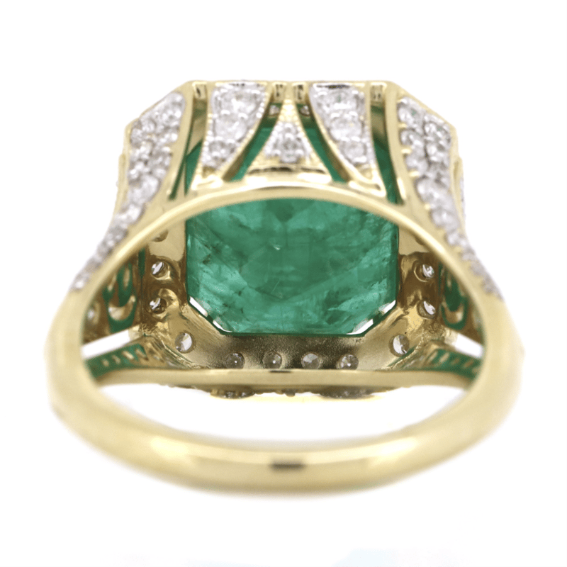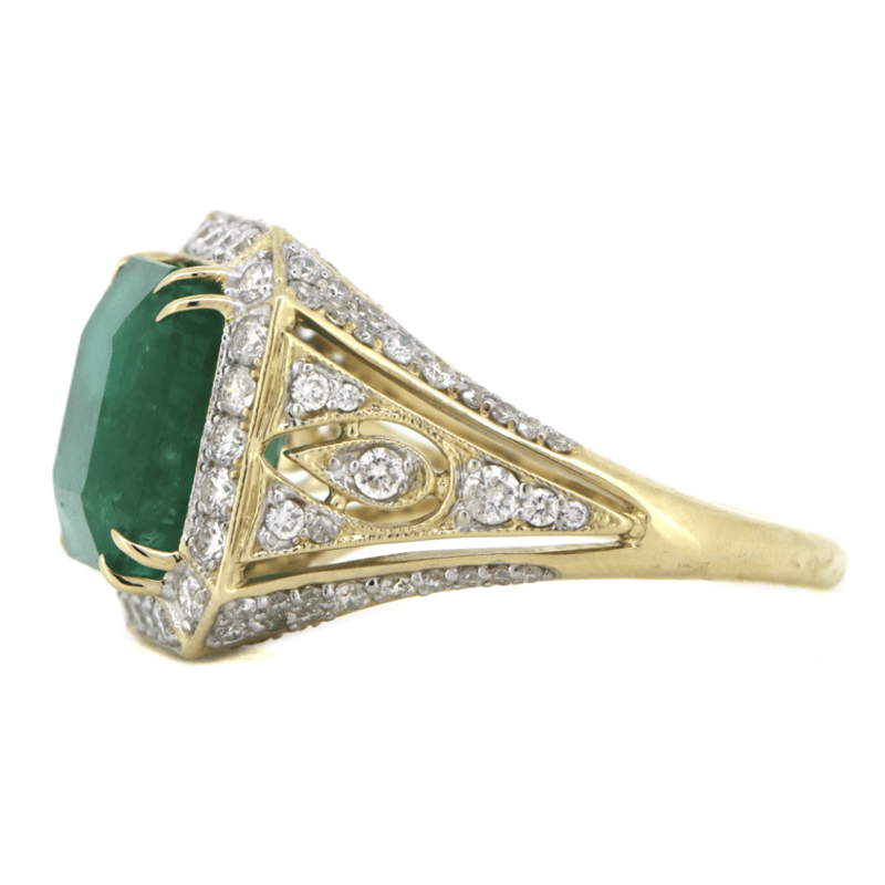 14K YELLOW GOLD, 5.41CT ZAMBIAN EMERALD AND DIAMOND, COCKTAIL RING The Centre Features, One Emerald Mixed Cut, Deep Moderate Bluish-Green, Zambian Emerald (5.41Ct, Heavily Included), Double 4 Claw Set. Surrounding The Centre In A Halo And Decorating The Shoulders Are, 100 Round Brilliant Cut, Diamonds (1.33Ct Tdw, G-H Colour, Si1-Si2 Clarity), Bead Set In White Gold With Millegrain Detail. Ring Size O 1/2. Jewellery Valuations Provided By A Third Party Professional Not Directly Associated With Lloyds Auctions at AUD $$46,000.00This Insurance Valuation has been provided by a registered Jewellery Valuer and is intended for insurance purposes only. The valuation amount has no bearing on the auction value of the item. Any questions regarding the valuation should be directed to the issuing Valuer (refer to contact details on the certificate) as Lloyds have no association or relationship with the Valuer or the valuation amount contained within the valuation. Condition: NEW 0645875+5296