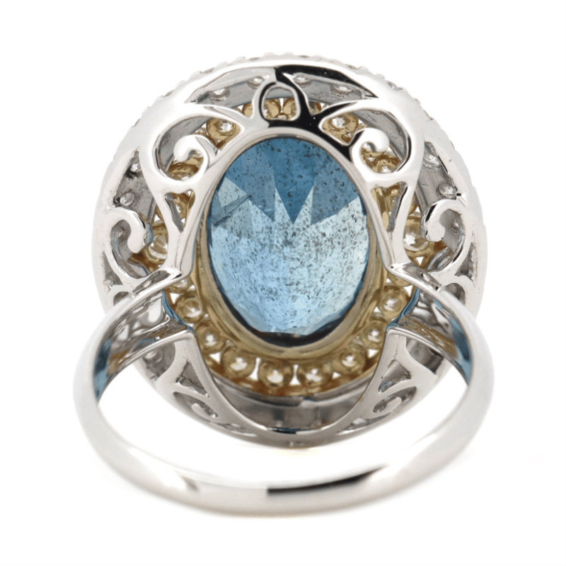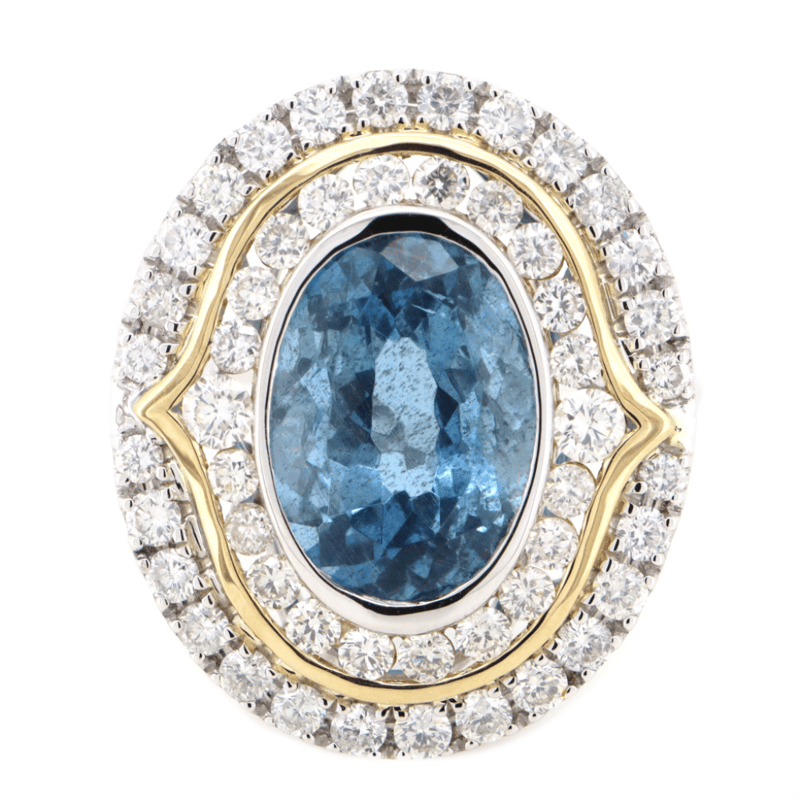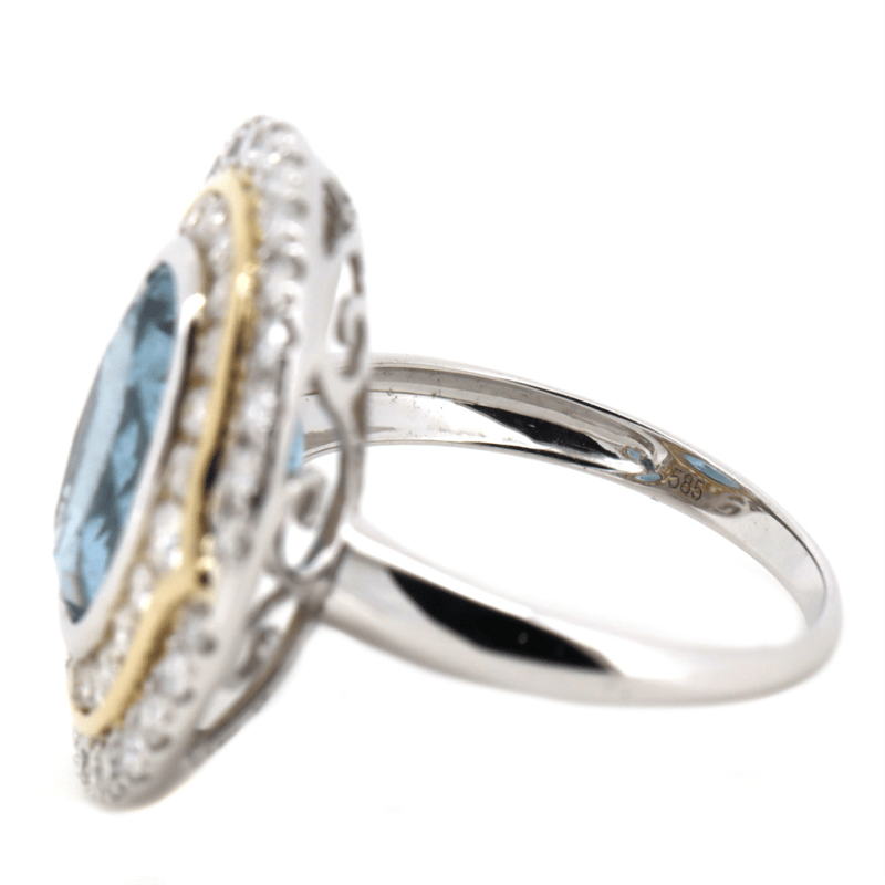 14K WHITE/YELLOW GOLD, AQUAMARINE AND DIAMOND, DOUBLE HALO RING