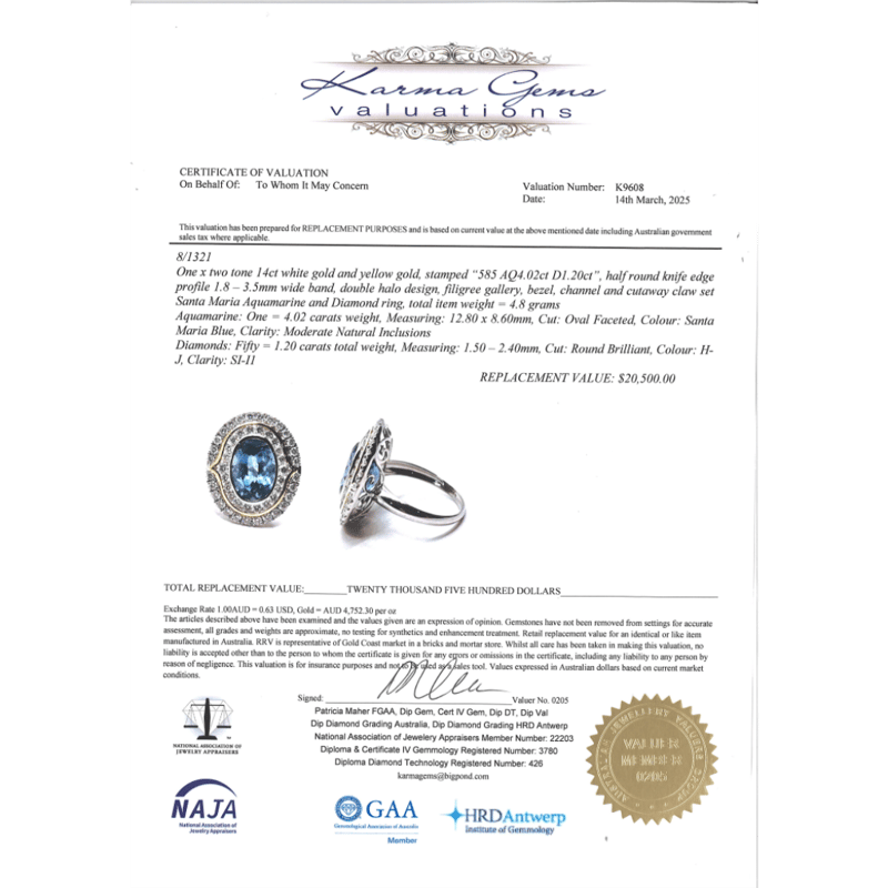 The Centre Features, One Oval Faceted Cut, Santa Maria Blue, Aquamarine (4.02Ct, Moderate Natural Inclusions), Bezel Set. Surrounding The Centre In A Double Halo Are, 50 Round Brilliant Cut, Diamonds (1.20Ct Tdw, H-J Colour, Si-I1 Clarity), Micro-Claw/Channel Set In White/Yellow Gold. Ring Size M 1/2.