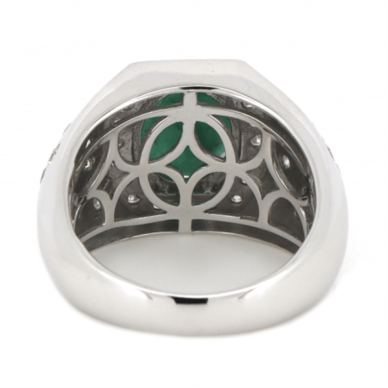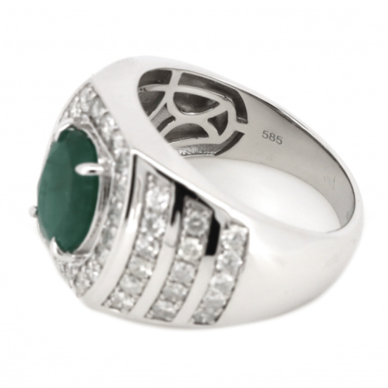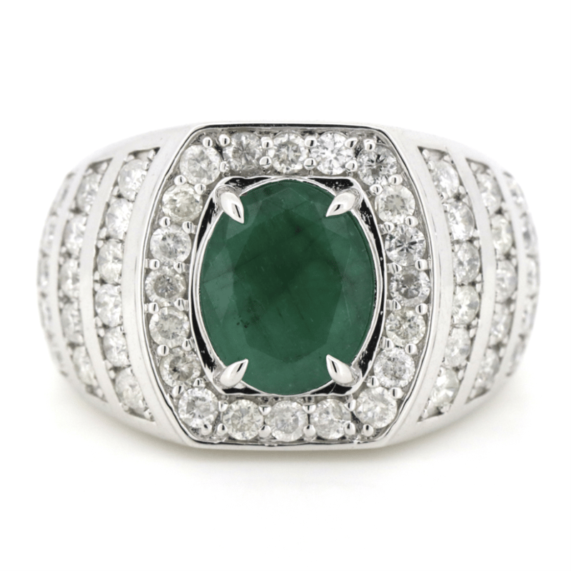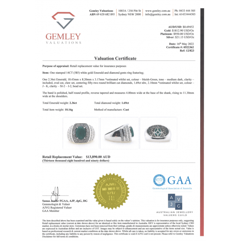 14K WHITE GOLD, EMERALD AND DIAMOND, GENTS RING The Centre Features, One Oval Cut, Medium Dark Bluish-Green, Emerald (2.36Ct, Included), Claw Set. Surrounding The Centre In A Halo And Decorating The Shoulders Are, 52 Round Brilliant Cut, Diamonds (1.69Ct Tdw, J-K Colour, Si2-I2 Clarity), Bead Set. Ring Size S 1/2. Jewellery Valuations Provided By A Third Party Professional Not Directly Associated With Lloyds Auctions at AUD $$13,890.00This Insurance Valuation has been provided by a registered Jewellery Valuer and is intended for insurance purposes only. The valuation amount has no bearing on the auction value of the item. Any questions regarding the valuation should be directed to the issuing Valuer (refer to contact details on the certificate) as Lloyds have no association or relationship with the Valuer or the valuation amount contained within the valuation. Condition: NEW 0645875+5269