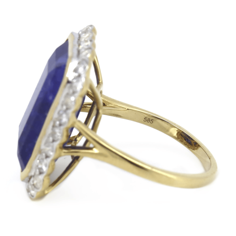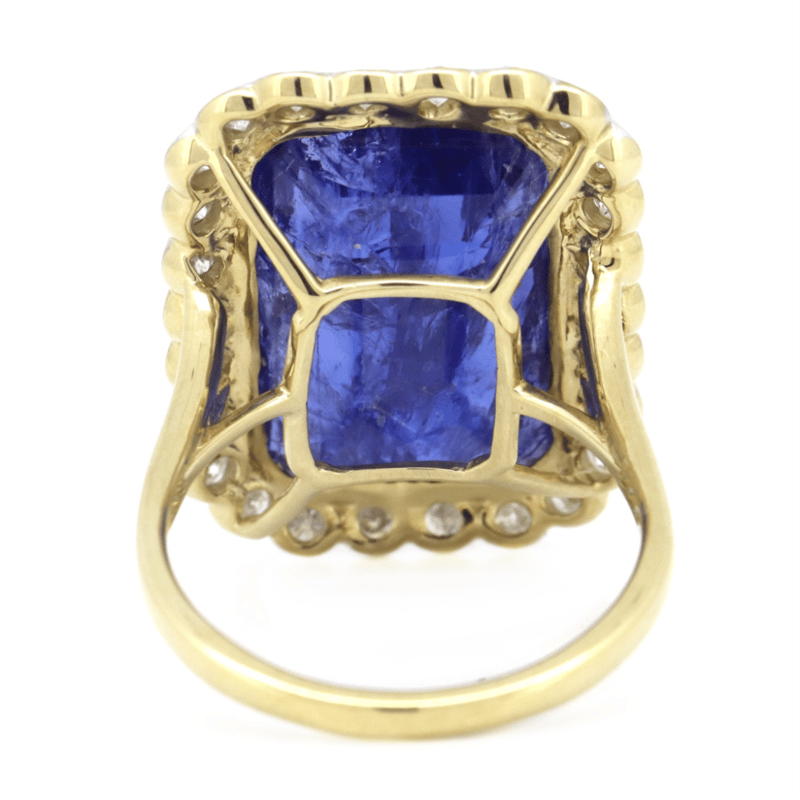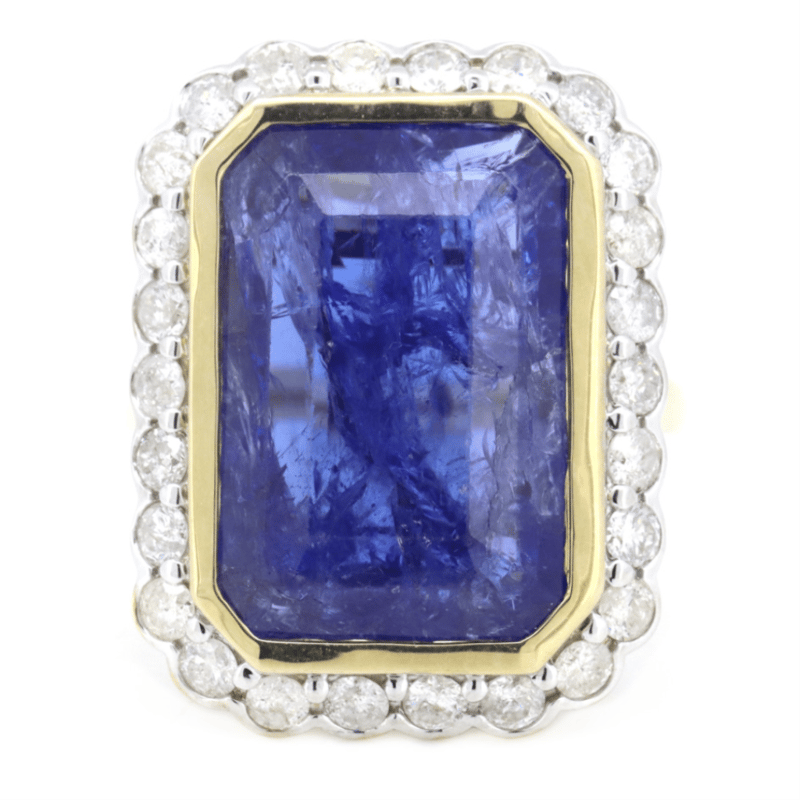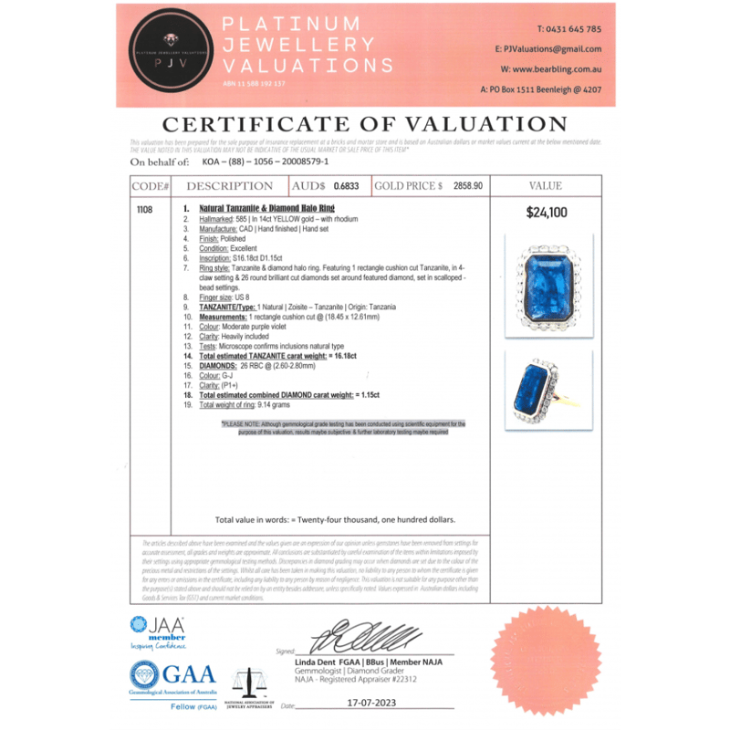 14K YELLOW GOLD, 16.18CT TANZANITE AND DIAMOND, HALO COCKTAIL RING The Centre Features, One Emerald Cut, Moderate Purple Violet, Tanzanite (16.18Ct, Heavily Included), Bezel Set. Surrounding The Centre In A Halo Are, 26 Round Brilliant Cut, Diamonds (1.15Ct Tdw, G-J Colour, P1+ Clarity), Semi-Bezel/Bead Set. Ring Size P. Jewellery Valuations Provided By A Third Party Professional Not Directly Associated With Lloyds Auctions at AUD $$24,100.00This Insurance Valuation has been provided by a registered Jewellery Valuer and is intended for insurance purposes only. The valuation amount has no bearing on the auction value of the item. Any questions regarding the valuation should be directed to the issuing Valuer (refer to contact details on the certificate) as Lloyds have no association or relationship with the Valuer or the valuation amount contained within the valuation. Condition: NEW 0645875+5266