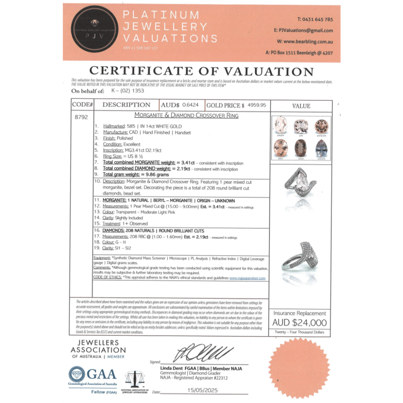 This Insurance Valuation has been provided by a registered Jewellery Valuer and is intended for insurance purposes only. The valuation amount has no bearing on the auction value of the item. Any questions regarding the valuation should be directed to the issuing Valuer (refer to contact details on the certificate) as Lloyds have no association or relationship with the Valuer or the valuation amount contained within the valuation.