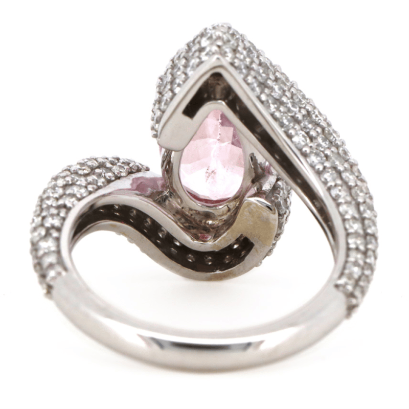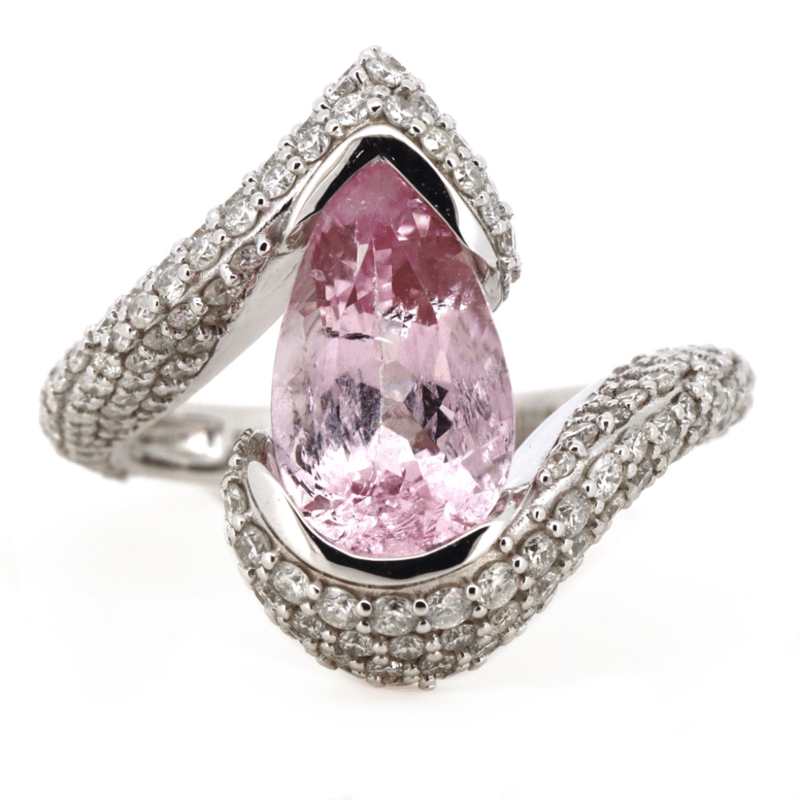 The Centre Features, One Pear Cut, Moderate-Light Pink, Morganite (3.41Ct, Slightly Included, Enhanced), Semi-Bezel Set. Embellishing The Design Are, 208 Round Brilliant Cut, Diamonds (2.19Ct Tdw, G-H Colour, Si1-Si2 Clarity), Bead Set. Ring Size Q 1/2.