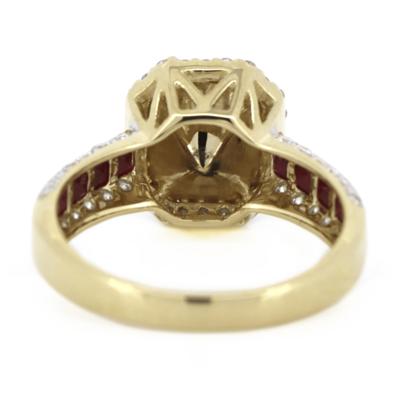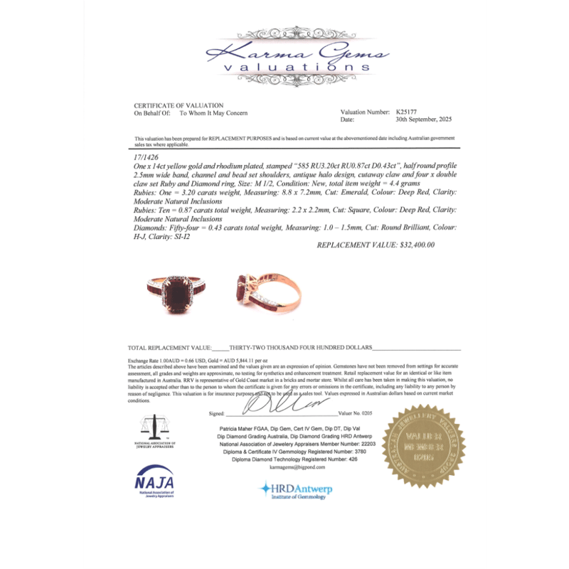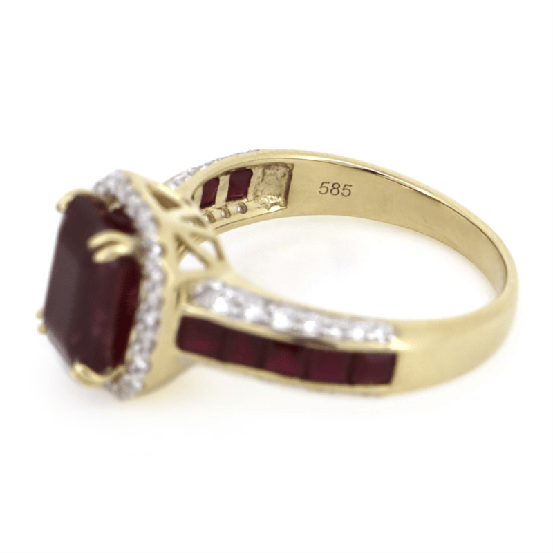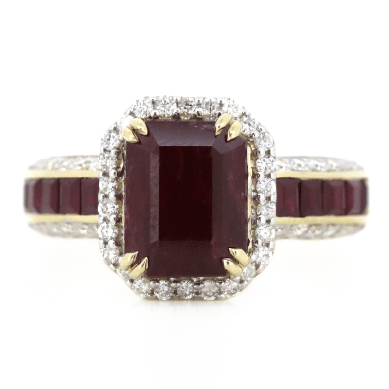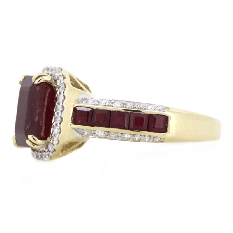 The Centre Features, One Emerald Cut, Deep Red, Ruby (3.20Ct, Moderate Inclusions), 4 Claw Set. Surrounding The Centre In A Halo And Decorating The Band Are, 54 Round Brilliant Cut, Diamonds (0.43Ct Tdw, H-J Colour, Si-I2 Clarity), Claw/Channel Set. Encompassing The Diamonds And Decorating The Band Are, 10 Square Cut, Deep Red, Rubies (0.87Ct Tsw, Moderate Inclusions), Channel Set. Ring Size M 1/2.