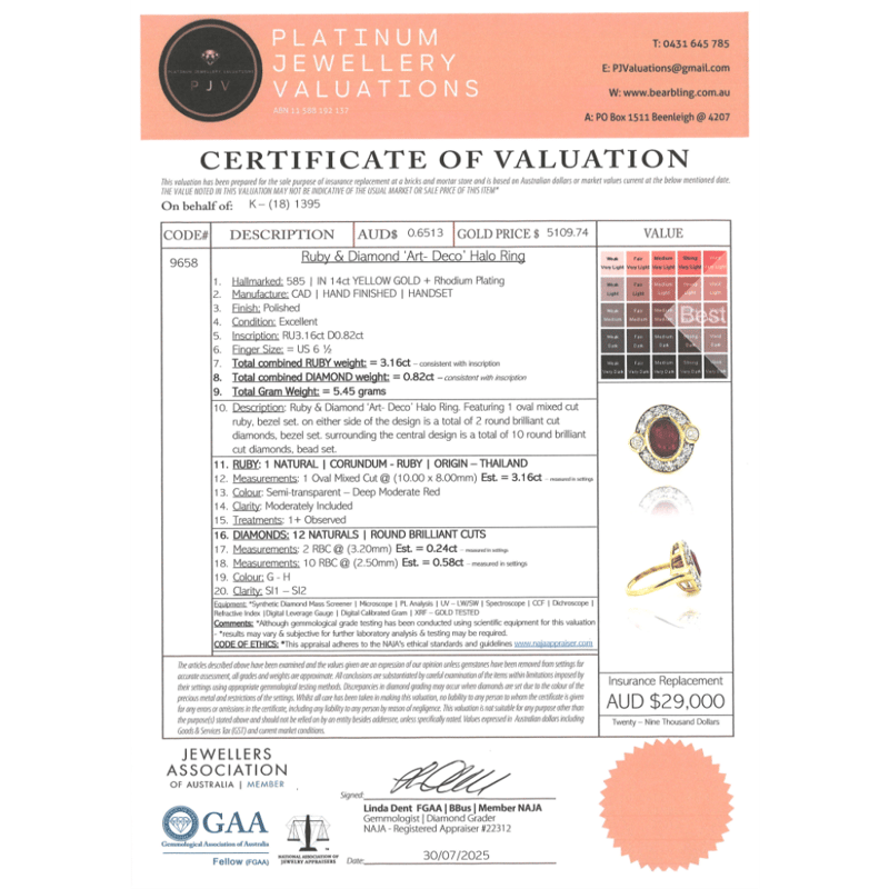 This Insurance Valuation has been provided by a registered Jewellery Valuer and is intended for insurance purposes only. The valuation amount has no bearing on the auction value of the item. Any questions regarding the valuation should be directed to the issuing Valuer (refer to contact details on the certificate) as Lloyds have no association or relationship with the Valuer or the valuation amount contained within the valuation.