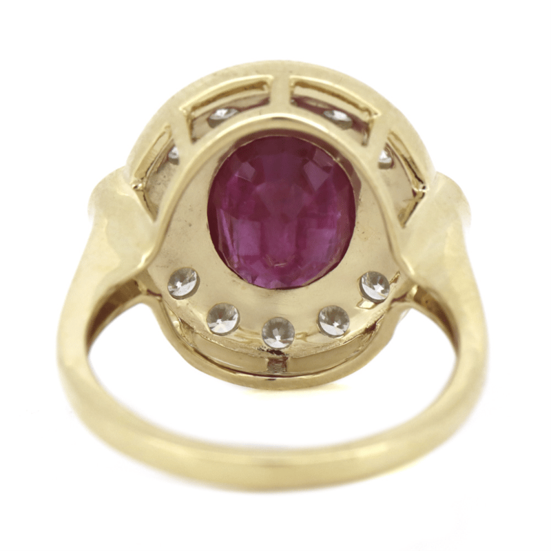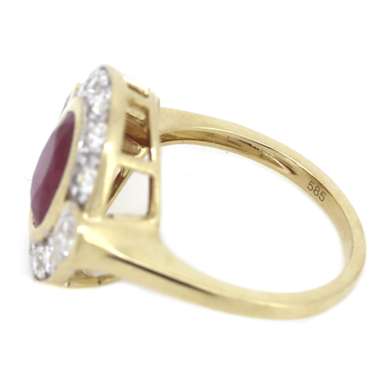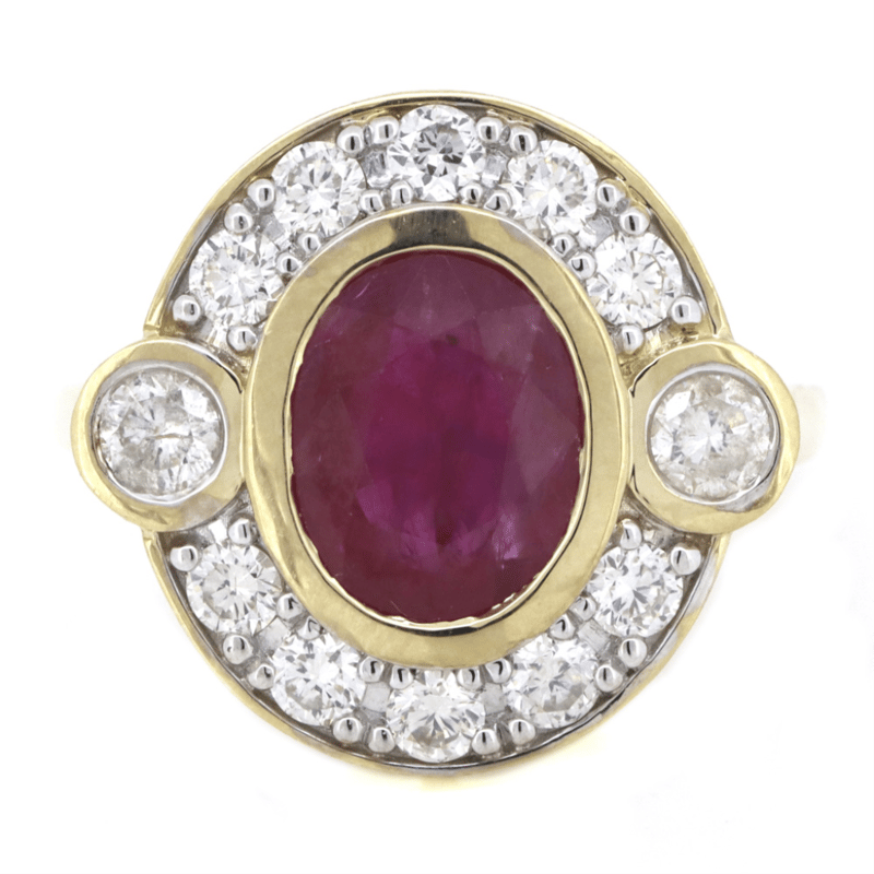 The Centre Features, One Oval Mixed Cut, Ruby (3.16Ct, Moderately Included), Bezel Set. Flanking Either Side Of The Centre Are, 2 Round Brilliant Cut, Diamonds (0.24Ct Tdw, G-H Colour, Si1-Si2 Clarity), Bezel Set. Surrounding The Central Design Are, 10 Round Brilliant Cut, Diamonds (0.58Ct Tdw, G-H Colour, Si1-Si2 Clarity), Bead Set In A Single Row Around The Outer Edge Of The Centre Setting In Halo Design. Ring Size M 1/2.