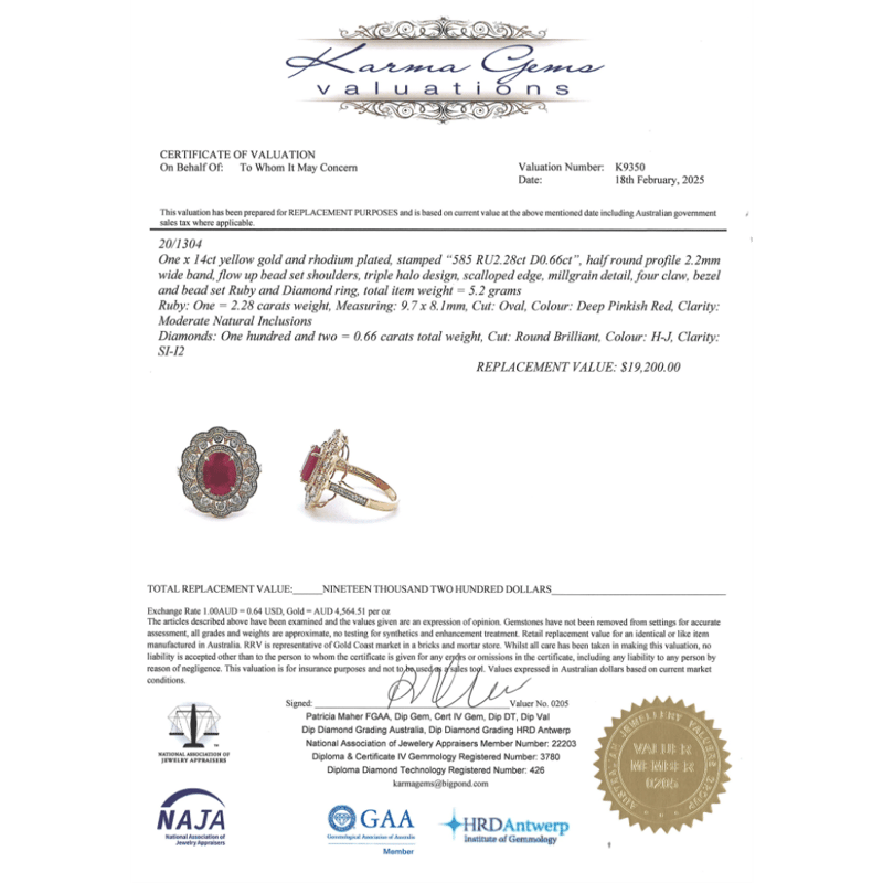 This Insurance Valuation has been provided by a registered Jewellery Valuer and is intended for insurance purposes only. The valuation amount has no bearing on the auction value of the item. Any questions regarding the valuation should be directed to the issuing Valuer (refer to contact details on the certificate) as Lloyds have no association or relationship with the Valuer or the valuation amount contained within the valuation.