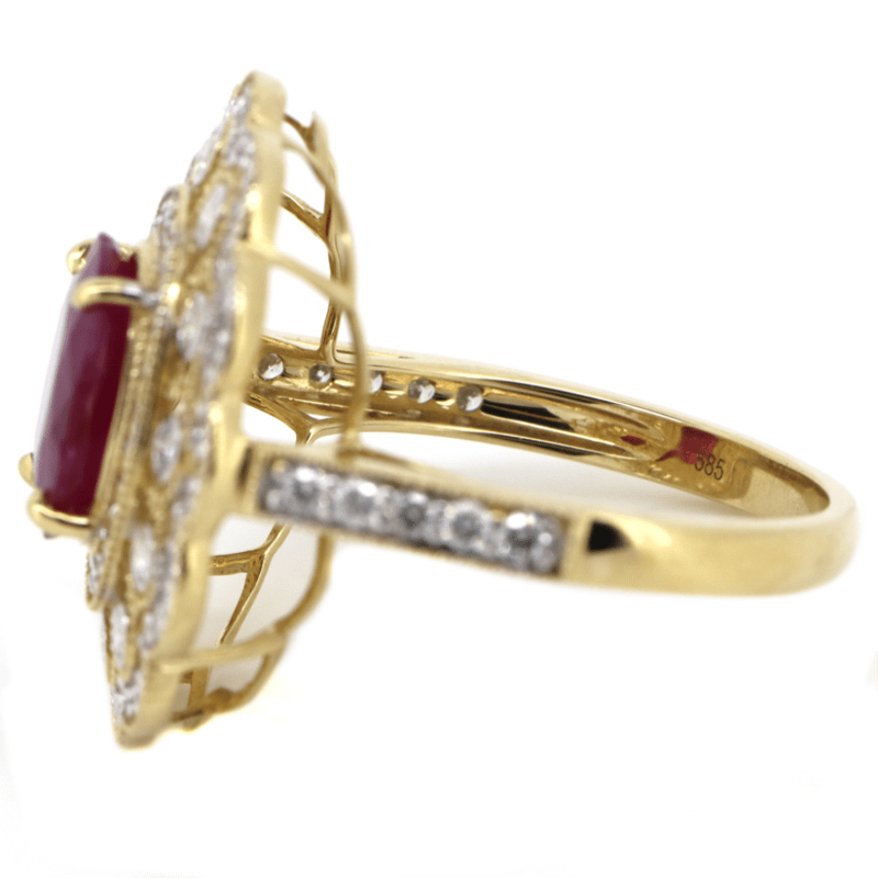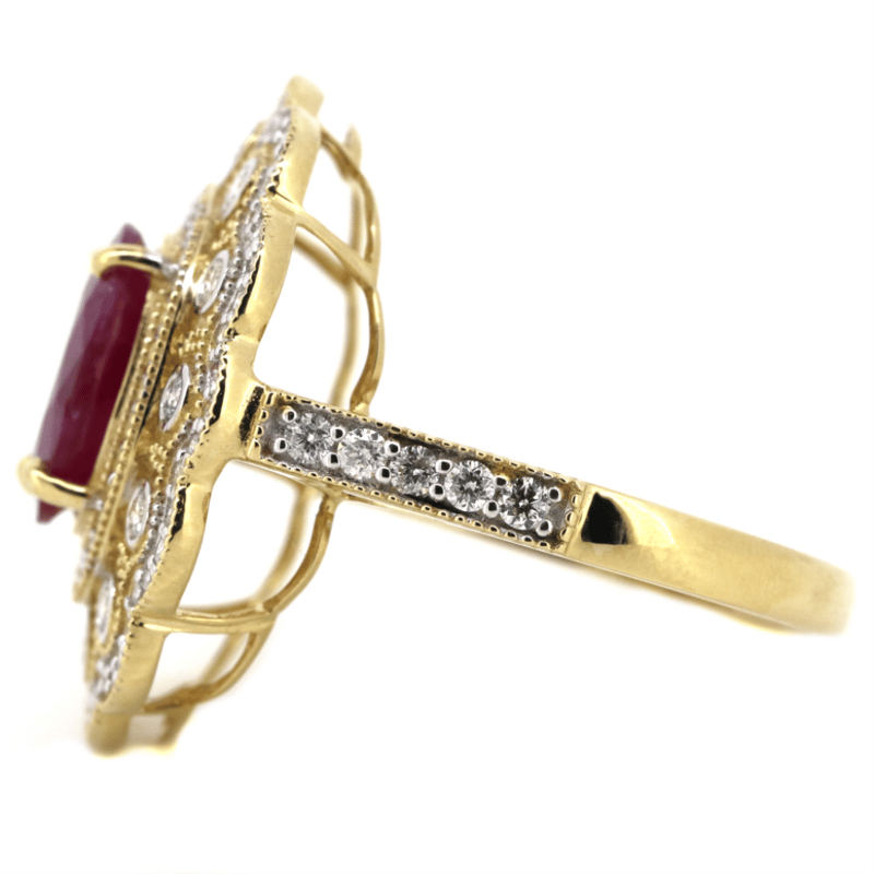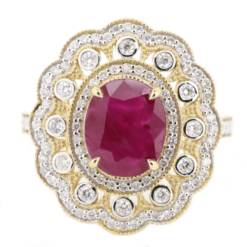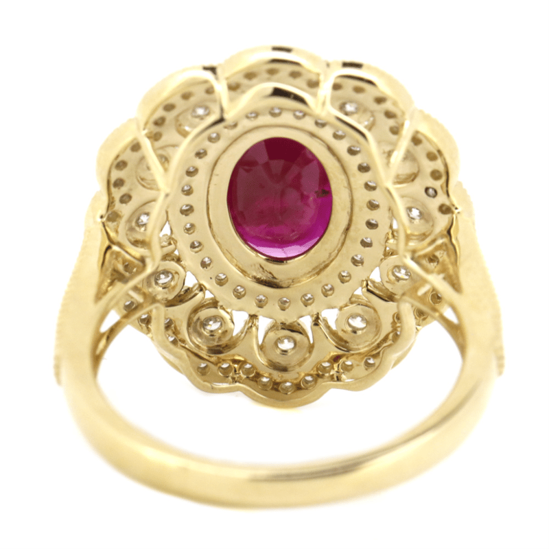 The Centre Features, One Oval Cut, Deep Pinkish-Red, Ruby (2.28Ct, Moderate Natural Inclusions), 4 Claw Set. Surrounding The Centre In A Halo Are, 102 Round Brilliant Cut, Diamonds (0.66Ct Tdw, H-J Colour, Si1-I2 Clarity), Bezel/Bead Set With Millegrain Detail. Ring Size O.