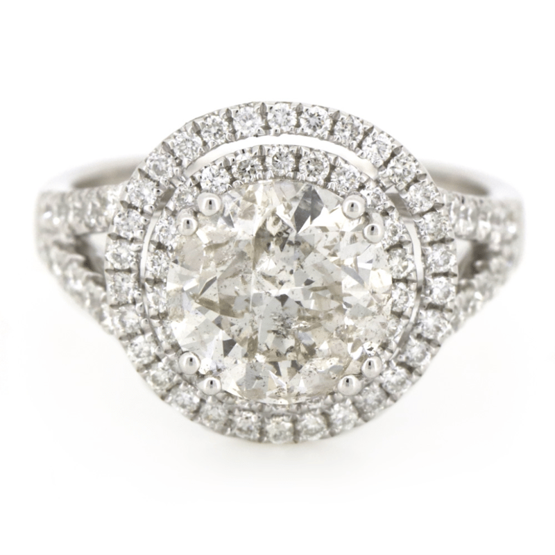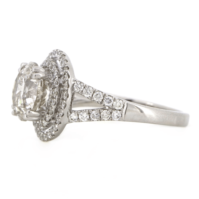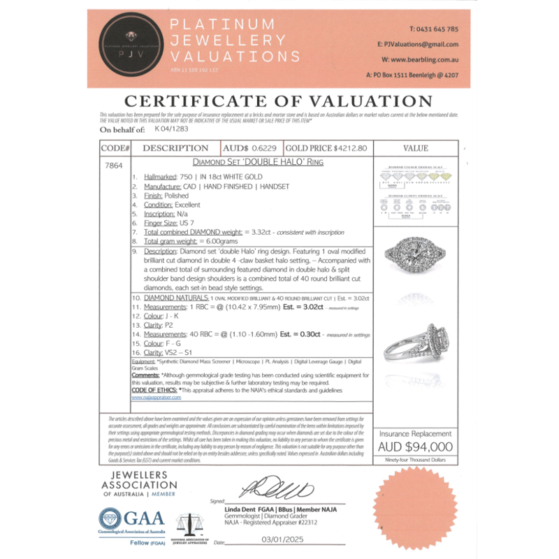 The Centre Features, One Oval Modified Brilliant Cut, Diamond (3.02Ct J-K Colour, P2 Clarity), Double 4 Claw Basket Set. Surrounding The Centre In A Double Halo Are, 40 Round Brilliant Cut, Diamonds (0.30Ct Tdw, F-G Colour, Vs2-S1), Bead Set. Ring Size N 1/2.