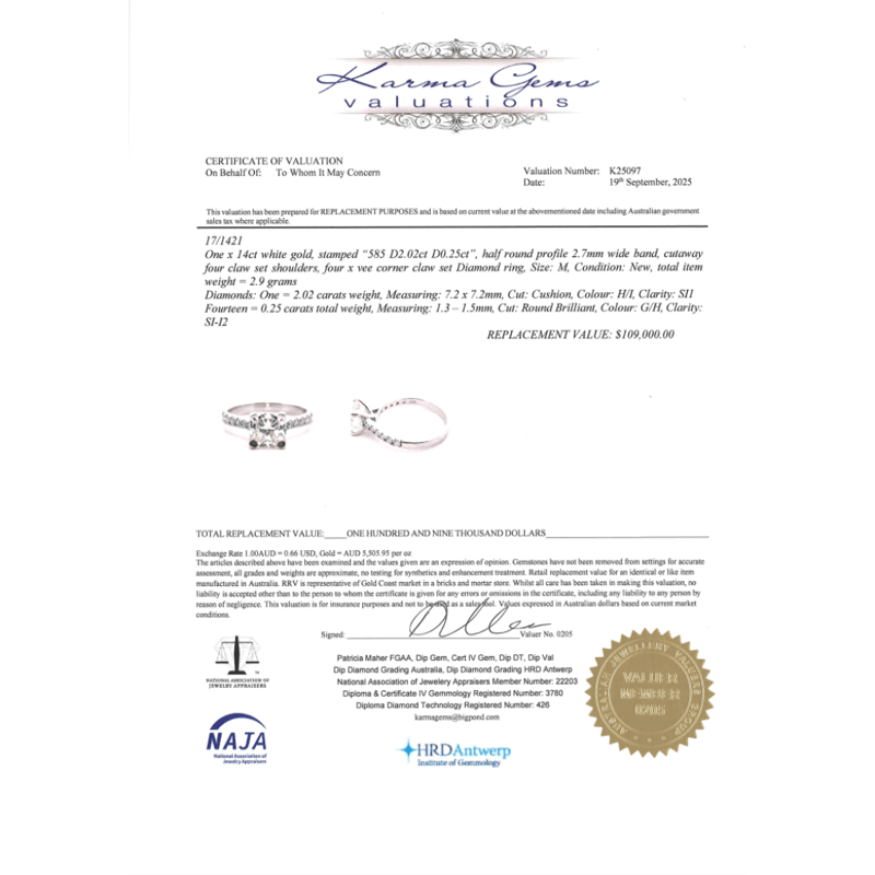 This Insurance Valuation has been provided by a registered Jewellery Valuer and is intended for insurance purposes only. The valuation amount has no bearing on the auction value of the item. Any questions regarding the valuation should be directed to the issuing Valuer (refer to contact details on the certificate) as Lloyds have no association or relationship with the Valuer or the valuation amount contained within the valuation.