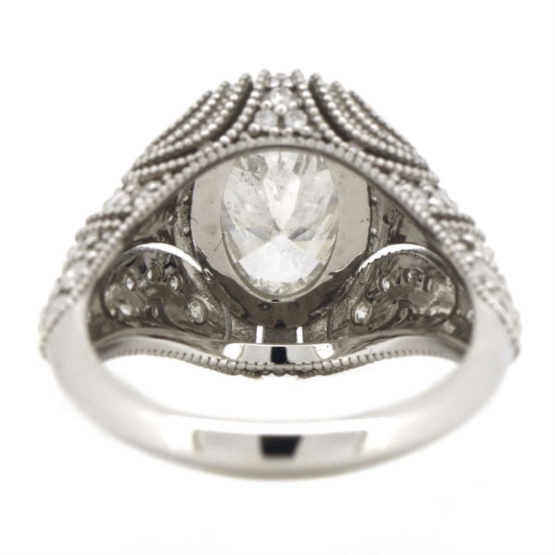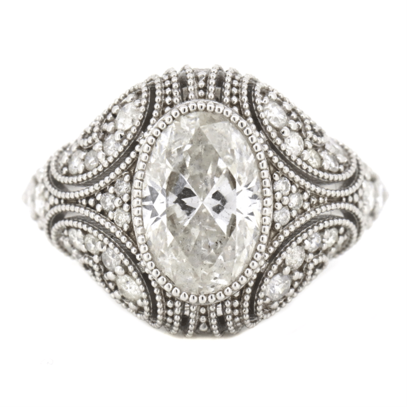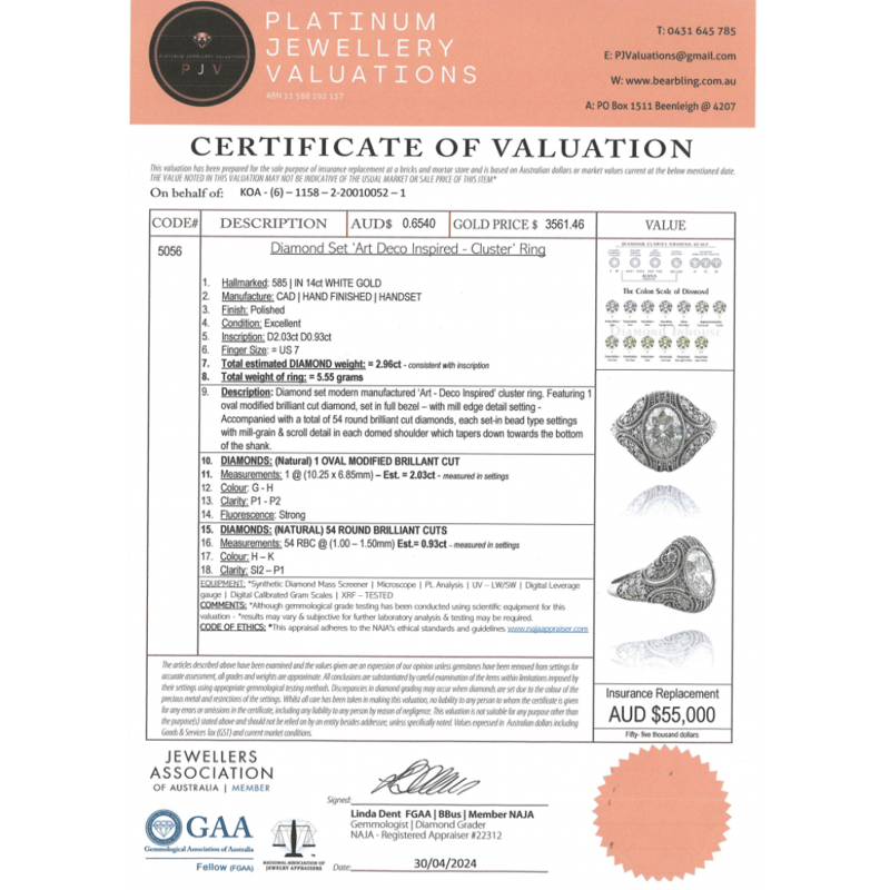 The Centre Features, One Oval Brilliant Cut, Diamond (2.03Ct, G-H Colour, P1-P2 Clarity), Bezel Set. Encompassing The Design Are, 54 Round Brilliant Cut, Diamonds (0.93Ct Tdw, H-K Colour, Si2-P1 Clarity), Bead Set. Ring Size N.