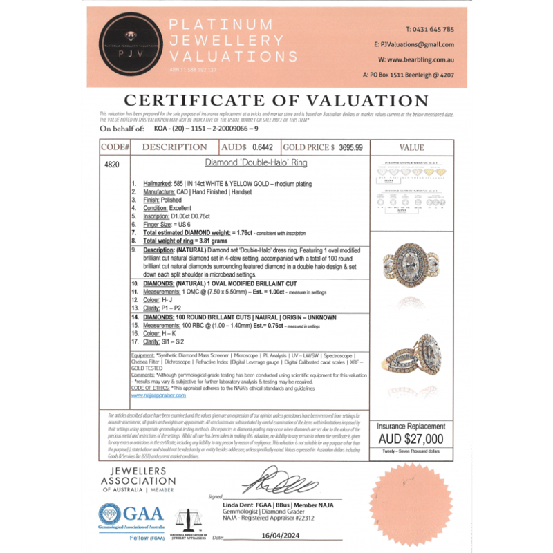 14K YELLOW/WHITE GOLD AND DIAMOND, DOUBLE HALO SPLIT BAND RING The Centre Features, One Oval Cut, Diamond (1.00Ct, H-J Colour, P1-P2 Clarity), 4 Claw Set. Surrounding The Centre In A Double Halo And Decorating The Band Are, 100 Round Brilliant Cut, Diamonds (0.76Ct Tdw, H-K Colour, Si1-Si2 Clarity), Micro-Bead Set In Yellow/White Gold. Ring Size L 1/2. Jewellery Valuations Provided By A Third Party Professional Not Directly Associated With Lloyds Auctions at AUD $$27,000.00This Insurance Valuation has been provided by a registered Jewellery Valuer and is intended for insurance purposes only. The valuation amount has no bearing on the auction value of the item. Any questions regarding the valuation should be directed to the issuing Valuer (refer to contact details on the certificate) as Lloyds have no association or relationship with the Valuer or the valuation amount contained within the valuation. Condition: NEW 0645875+5262