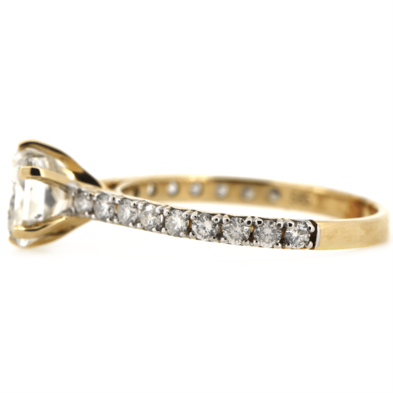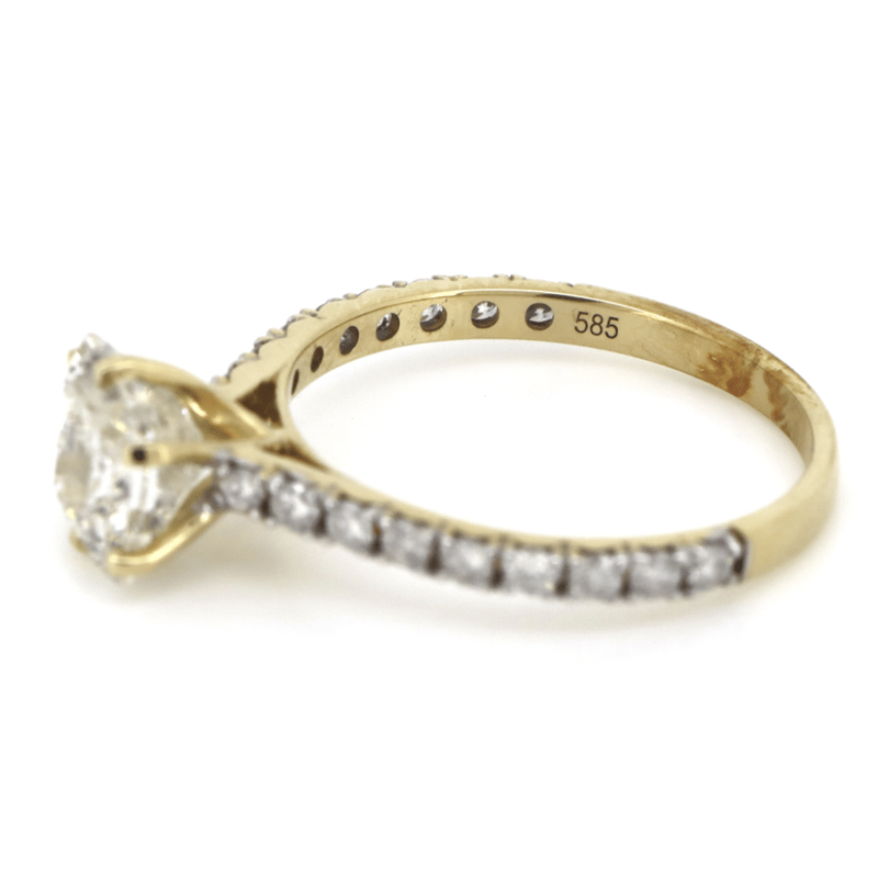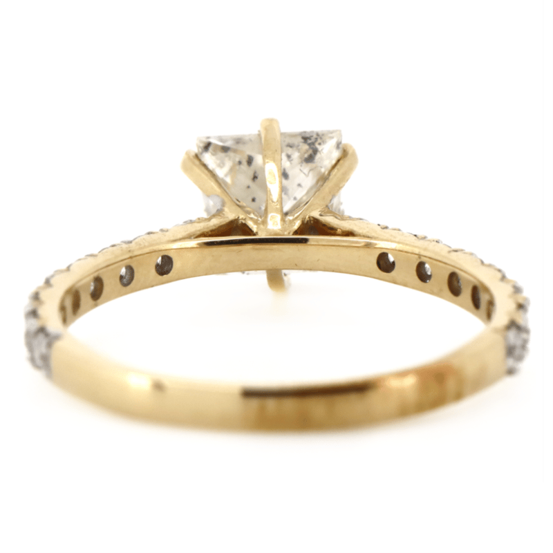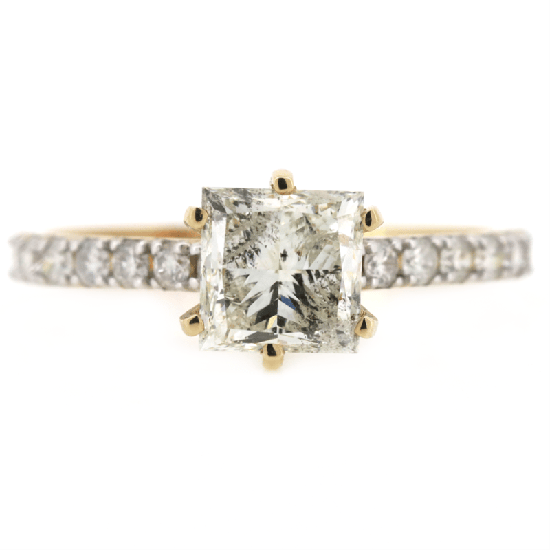 The Centre Features, One Princess Cut, Diamond (1.51Ct, H-I Colour, I1 Clarity), 6 Claw Set. Decorating The Band Are, 18 Round Brilliant Cut, Diamonds (0.364Ct Tdw, H-J Colour, Si Clarity), Bead Set. Ring Size L 1/2.