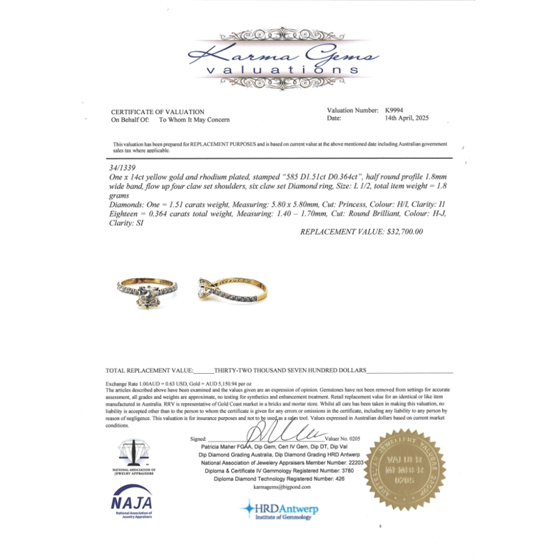 This Insurance Valuation has been provided by a registered Jewellery Valuer and is intended for insurance purposes only. The valuation amount has no bearing on the auction value of the item. Any questions regarding the valuation should be directed to the issuing Valuer (refer to contact details on the certificate) as Lloyds have no association or relationship with the Valuer or the valuation amount contained within the valuation.