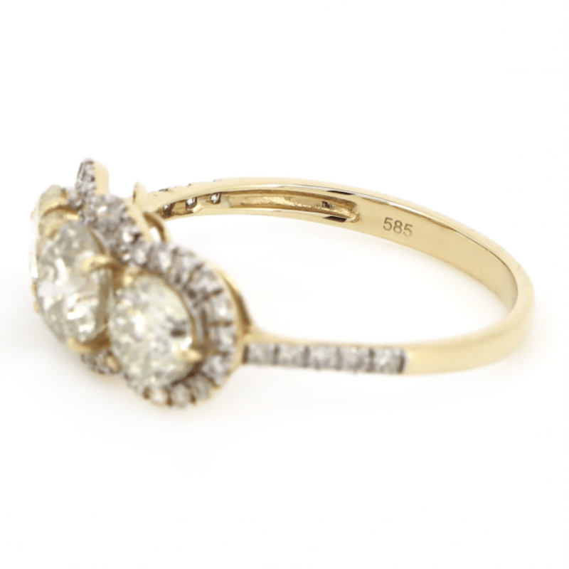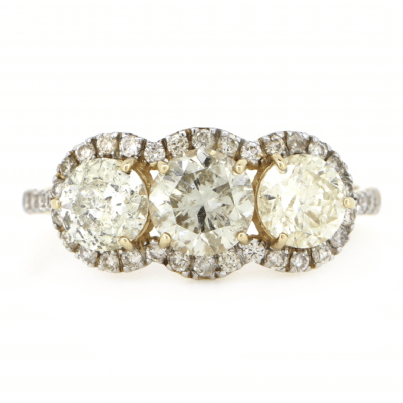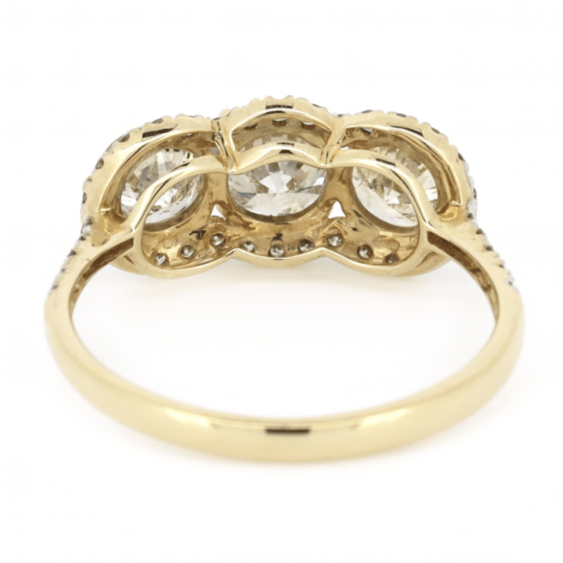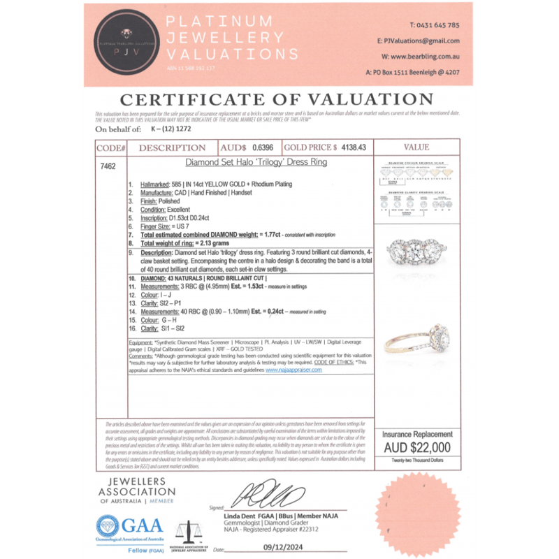14K YELLOW GOLD AND DIAMOND, HALO TRILOGY RING The Centre Features, 3 Round Brilliant Cut, Diamonds (1.53Ct Tdw, I-J Colour, Si2-P1 Clarity), 4 Claw Set. Encompassing The Centre In A Halo And Decorating The Band Are, 40 Round Brilliant Cut, Diamonds (0.24Ct Tdw, G-H Colour, Si2 Clarity), Claw Set. Ring Size N 1/2. Jewellery Valuations Provided By A Third Party Professional Not Directly Associated With Lloyds Auctions at AUD $$22,000.00This Insurance Valuation has been provided by a registered Jewellery Valuer and is intended for insurance purposes only. The valuation amount has no bearing on the auction value of the item. Any questions regarding the valuation should be directed to the issuing Valuer (refer to contact details on the certificate) as Lloyds have no association or relationship with the Valuer or the valuation amount contained within the valuation. Condition: NEW 0645875+5265
