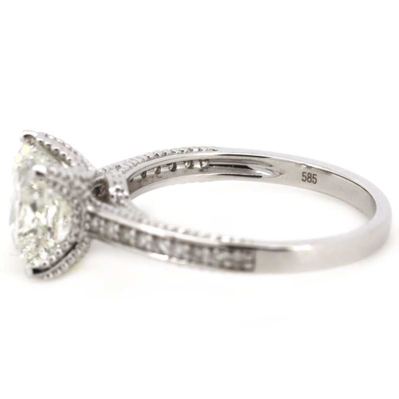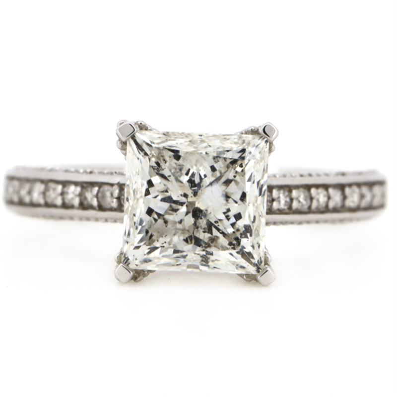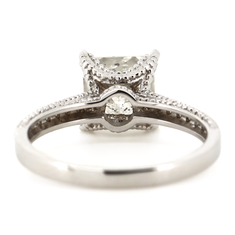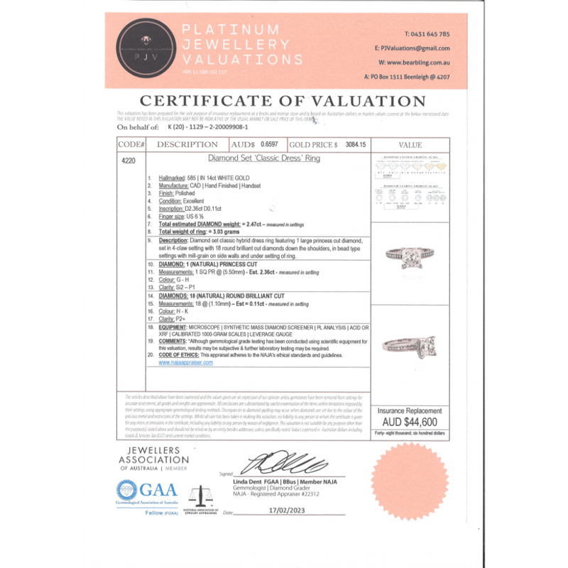 14K WHITE GOLD AND DIAMOND, CLASSIC RING The Centre Features, One Princess Cut, Diamond (2.36Ct, G-H Colour, P2+ Clarity), 4 Claw Set, Decorating The Band Are, 18 Round Brilliant Cut, Diamonds (0.11Ct Tdw, H-K Colour, P2+ Clarity), Bead Set. Ring Size M 1/2. Jewellery Valuations Provided By A Third Party Professional Not Directly Associated With Lloyds Auctions at AUD $$44,600.00This Insurance Valuation has been provided by a registered Jewellery Valuer and is intended for insurance purposes only. The valuation amount has no bearing on the auction value of the item. Any questions regarding the valuation should be directed to the issuing Valuer (refer to contact details on the certificate) as Lloyds have no association or relationship with the Valuer or the valuation amount contained within the valuation. Condition: NEW 0645875+5219