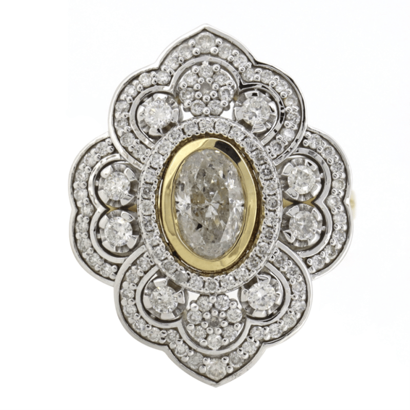 The Centre Features, One Oval Modified Brilliant Cut, Diamond (1.00Ct, H-I Colour, P2 Clarity), Bezel Set. Encompassing The Design Are, 108 Round Brilliant Cut, Diamonds (0.81Ct Tdw, G-I Colour, Si2-P2 Clarity), Bead/Claw Set. Ring Size O.