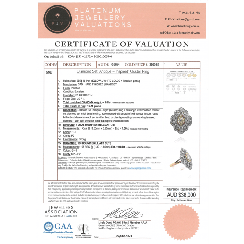 This Insurance Valuation has been provided by a registered Jewellery Valuer and is intended for insurance purposes only. The valuation amount has no bearing on the auction value of the item. Any questions regarding the valuation should be directed to the issuing Valuer (refer to contact details on the certificate) as Lloyds have no association or relationship with the Valuer or the valuation amount contained within the valuation.